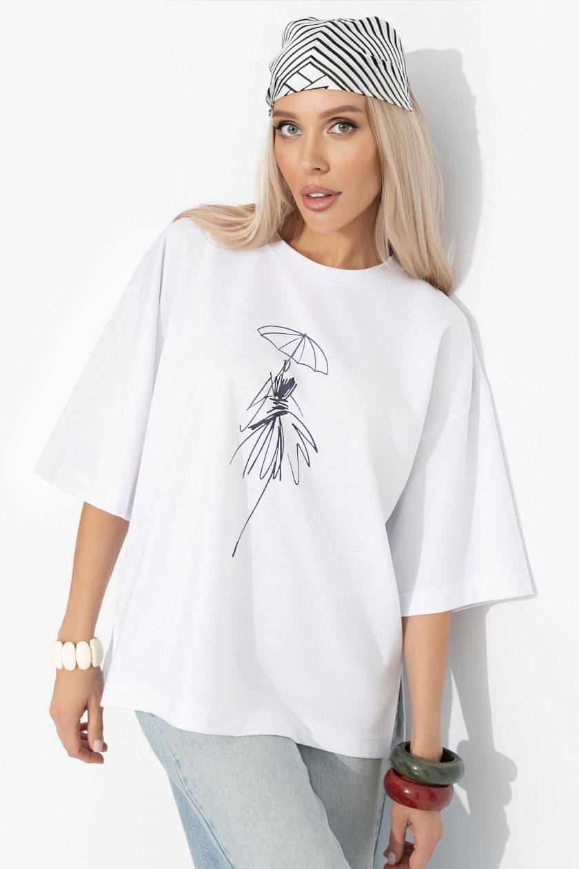 Футболка белая с милым принтом от компании Charutti. Модель прямого силуэта, линия плеча спущена. Принт напечатан на ткани. Принт по центральной части изделия и на рукавах. Деликатные разрезы по бокам изделия. Идеальный выбор на каждый день.