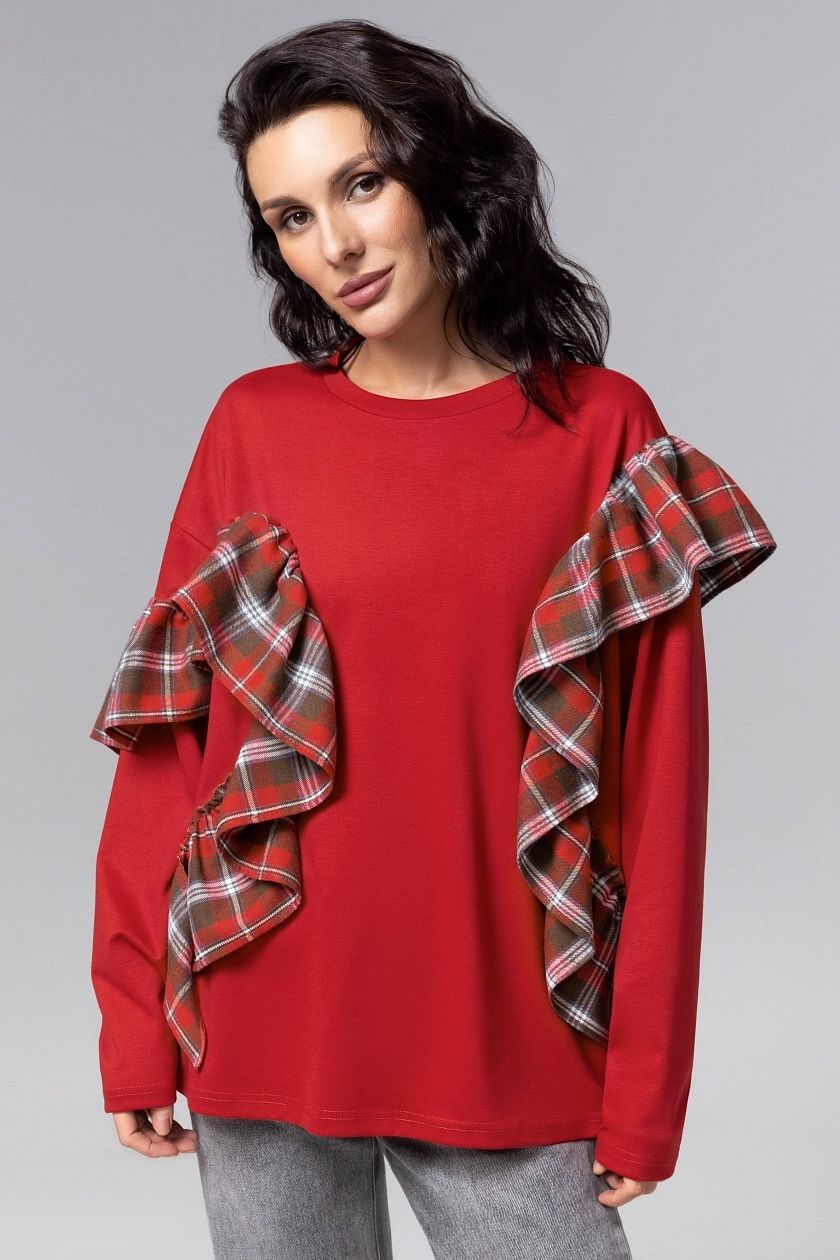 Лонгслив дизайнерский красного цвета от компании Charutti. Лонгслив свободного кроя, выполнен из трикотажного полотна. Круглый вырез горловины. Модель украшена элегантными объемными рюшами, которые создают выразительный акцент и подчеркивают женственный силуэт. Идеальный выбор для создания неповторимого образа.