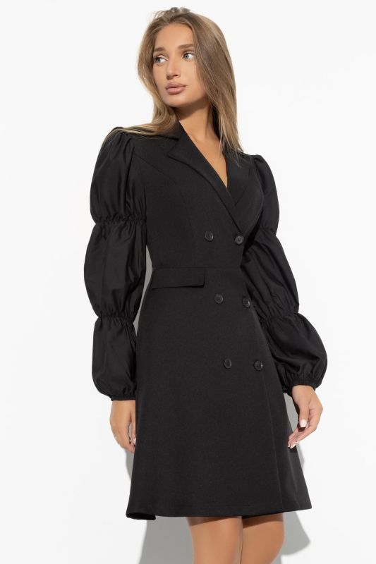 Платье-пиджак чёрное с оригинальными рукавами от бренда Charutti. Модель полуприлегающего силуэта, выполнена из костюмного полотна. V-образный вырез горловины с лацками. Втачные длинные рукава из поплина с резинками. Имитация карманов. Идеальный выбор для городских модниц.