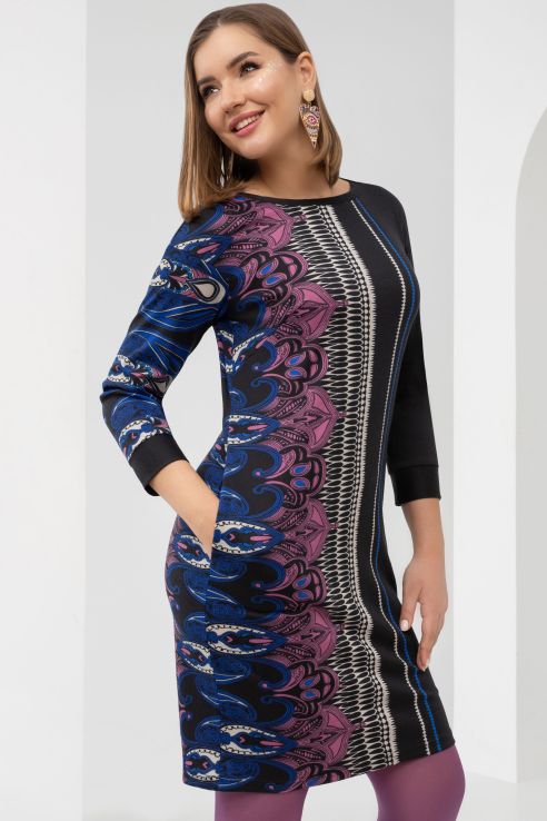 Симпатичное платье с принтом от компании Charutti. Модель прямого силуэта, выполнена из трикотажного полотна "понтирома". Горловина оформлена круглым вырезом. Втачные длинные рукава, со спущенной линией плеча. Прекрасное решение для похода в кафе.