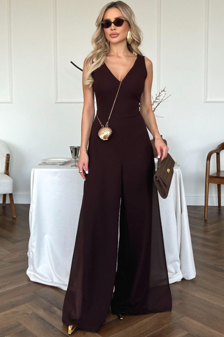 Комбинезон нарядный шоколадного цвета от производителя Jetty, выполнен из креп-трикотажа. Модель прилегающего силуэта, отрезная по линии талии. Брюки широкие со вставками по бокам из шифона. V-образный вырез по переду и по спинке. Потайная застежка молния расположена в среднем шве спинки. Стильный вариант для торжественного мероприятия.