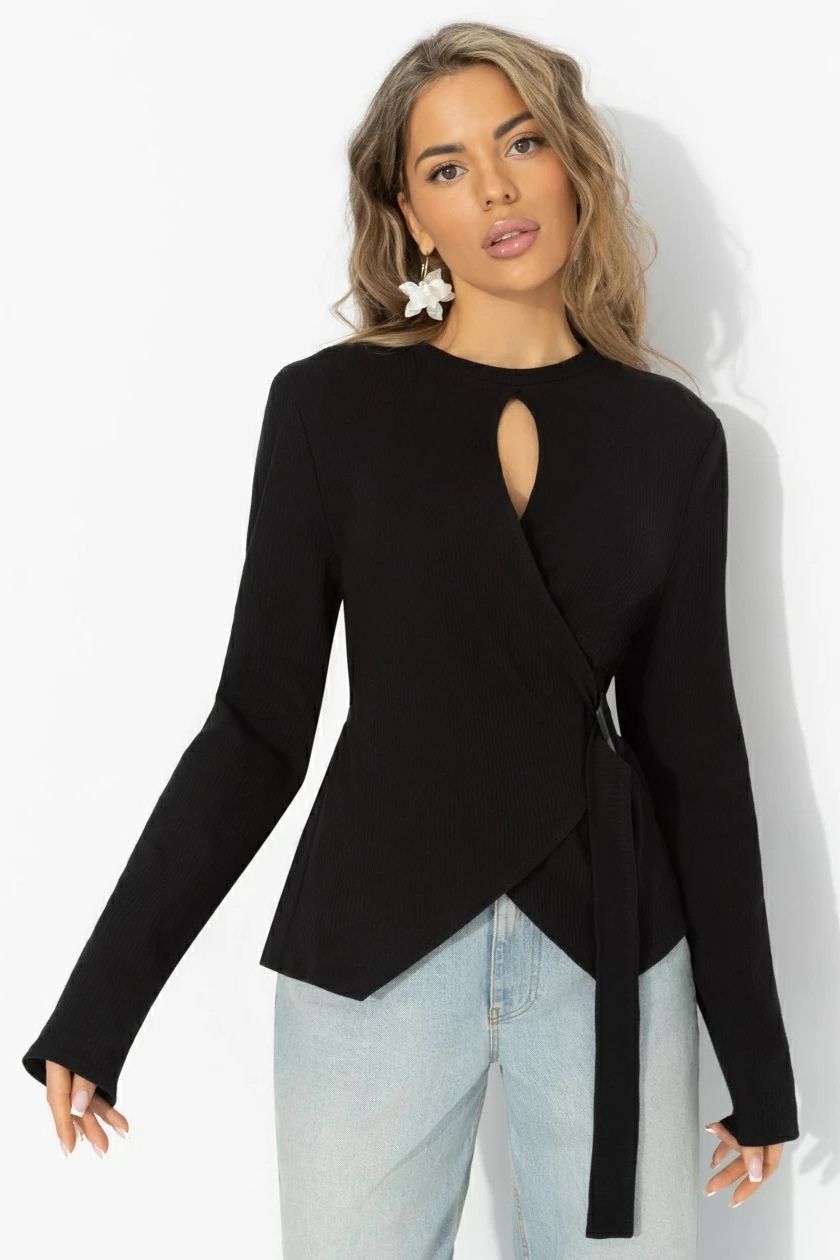 Джемпер чёрный трикотажный от компании Charutti. Полуприлегающий силуэт со спущенной линией плеча удлиняет шею. Асимметричный запах с поясом подчеркивает талию. Идеальный выбор на каждый день.