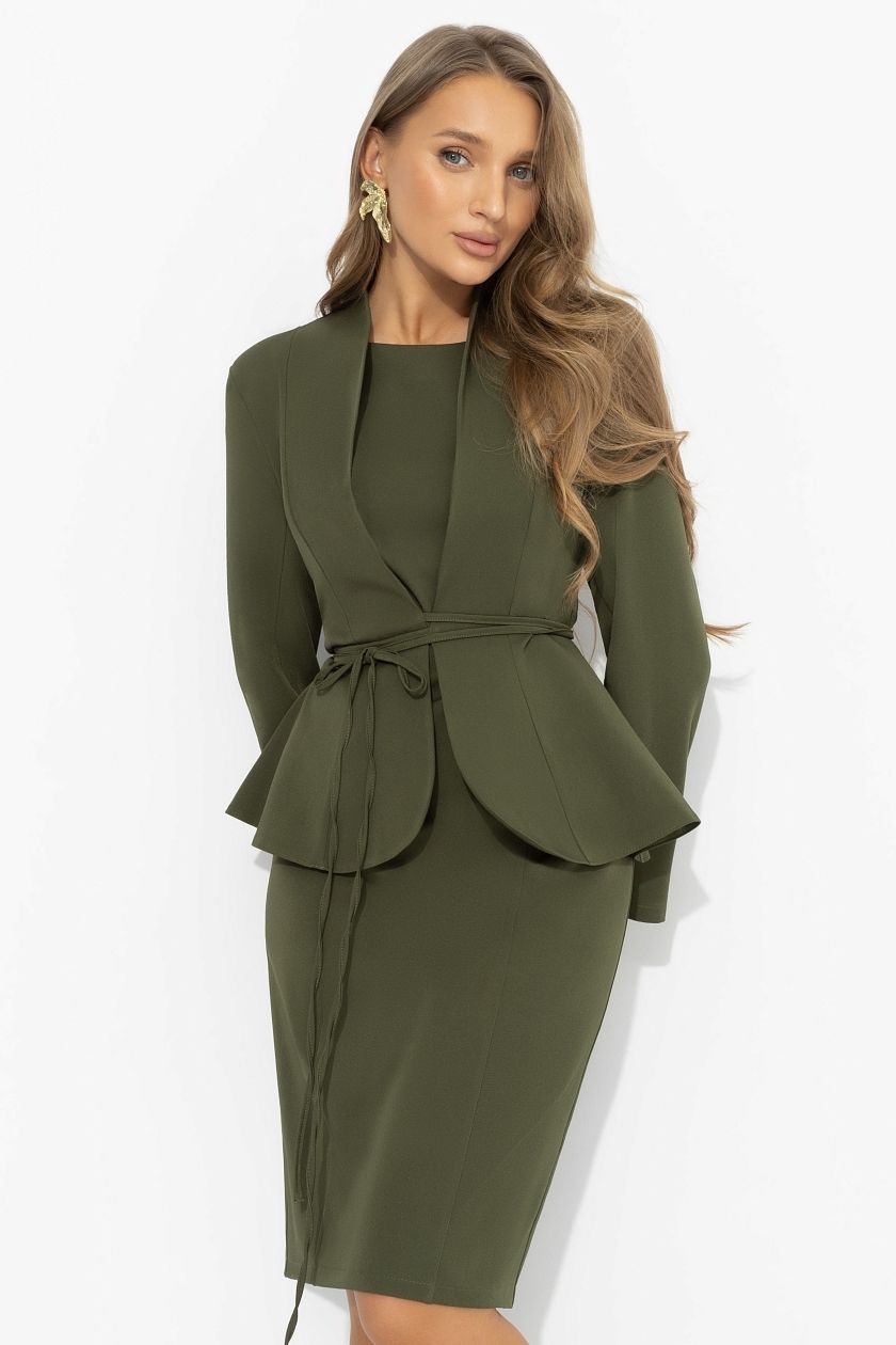 Костюм-двойка в оливковом цвете от компании Charutti, выполнен из костюмного полотна "барби". Стильный комплект: платье-футляр и жакет с поясом на завязках, подчёркивающим талию. Платье имеет классический крой, комфортную посадку. Жакет на подплечниках. Отличный выбор для Вашего безупречного образа.
