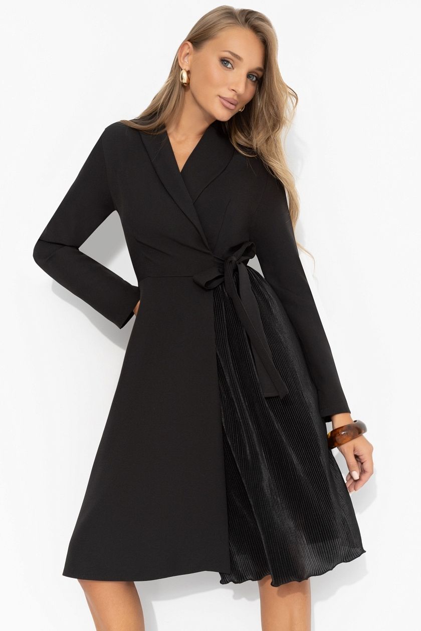 Платье чёрное на запах от компании Charutti, выполнено из костюмного полотна "барби". Приталенный силуэт формируется за счёт пояса. Платье с лацканами. Часть юбки выполнена из акцентного текстурного материала-гофре. Пояс вшит в изделие. Это Ваш отличный образ, в котором вы всегда чувствуете себя уверенно.