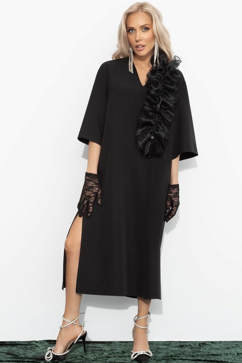 Платье чёрное со съёмным декором от бренда Charutti. Модель прямого кроя, выполнена из костюмной ткани "барби". V-образный вырез горловины. Низ ровный, по бокам разрезы. Рукава длиной 3/4. Идеальный выбор для городских модниц.