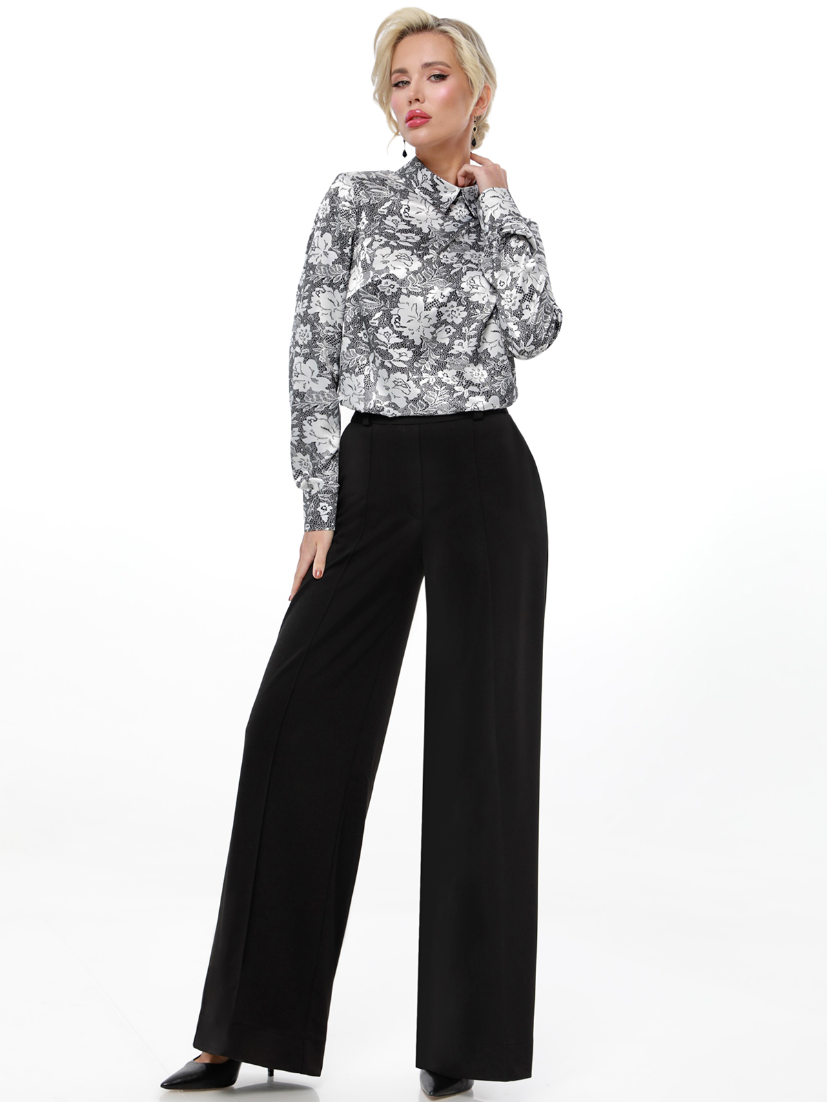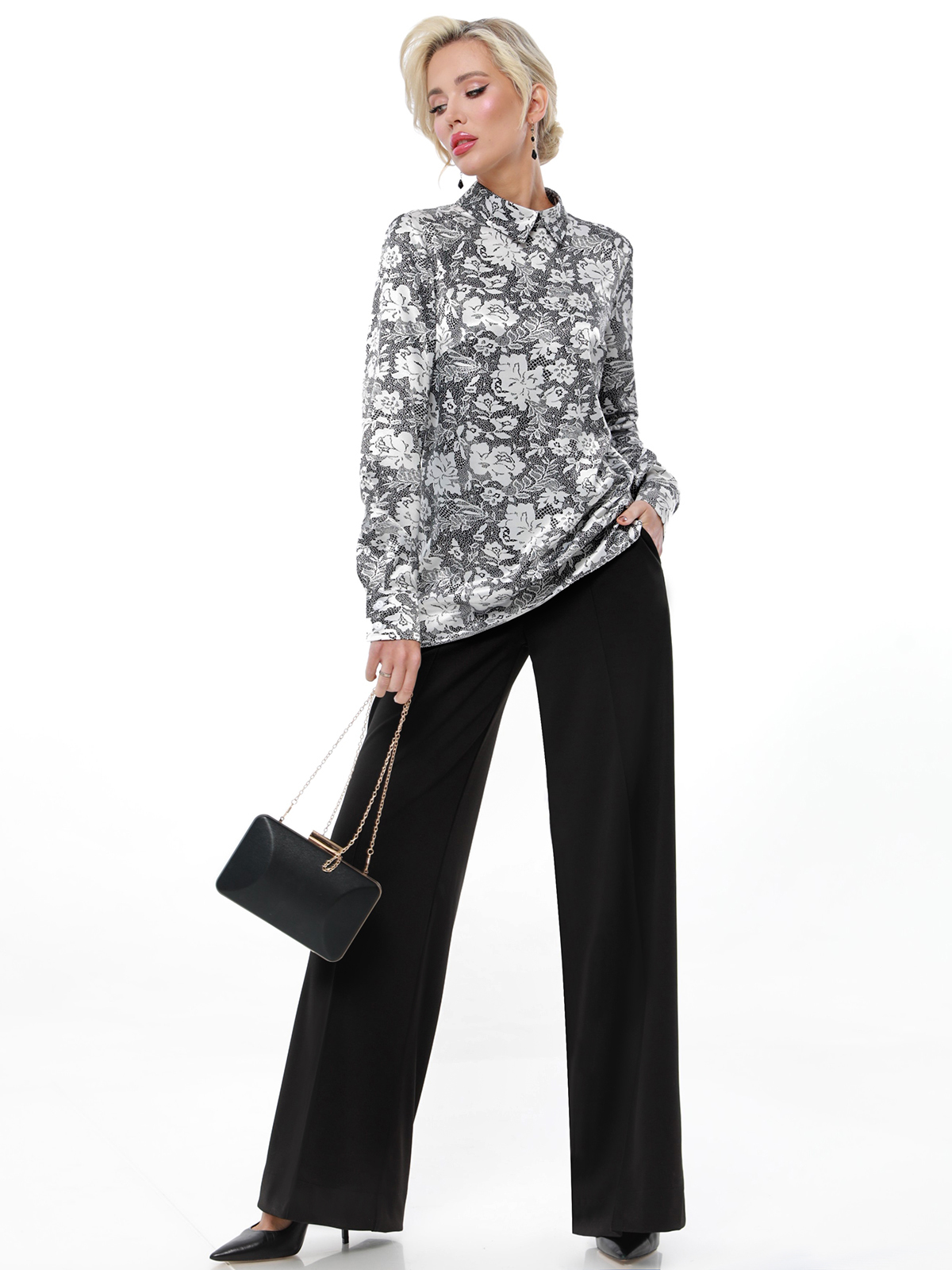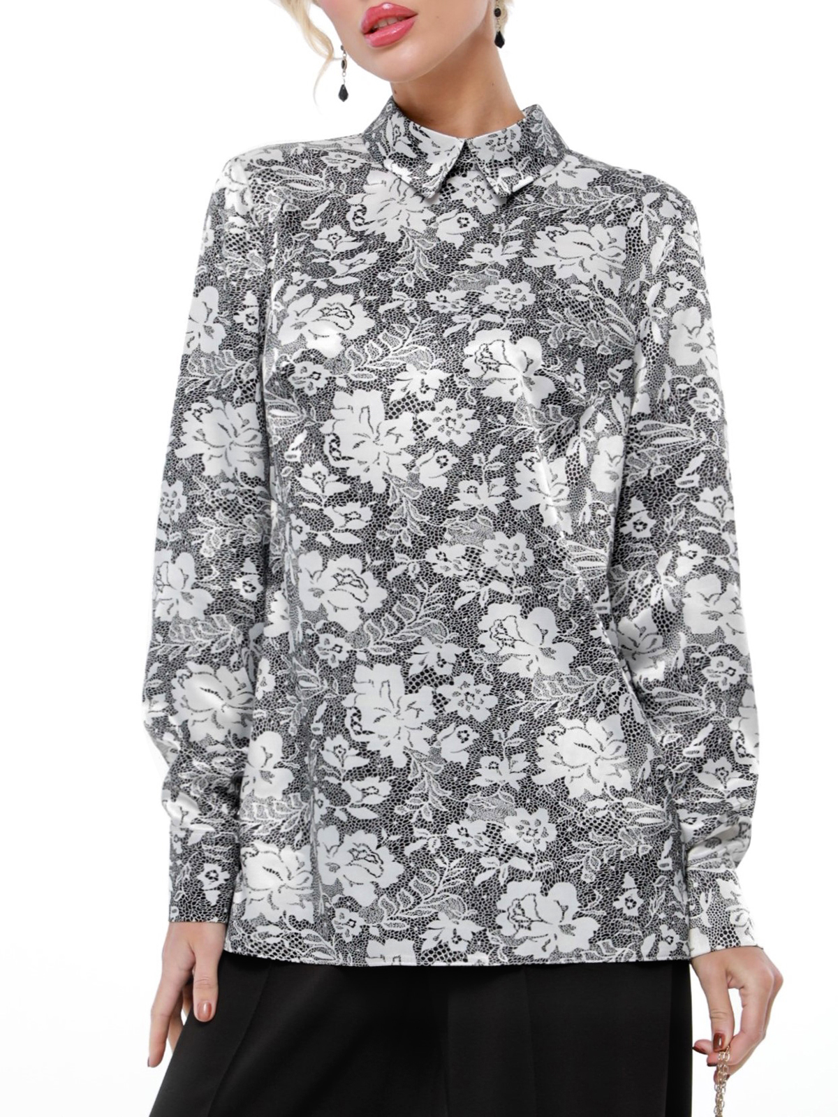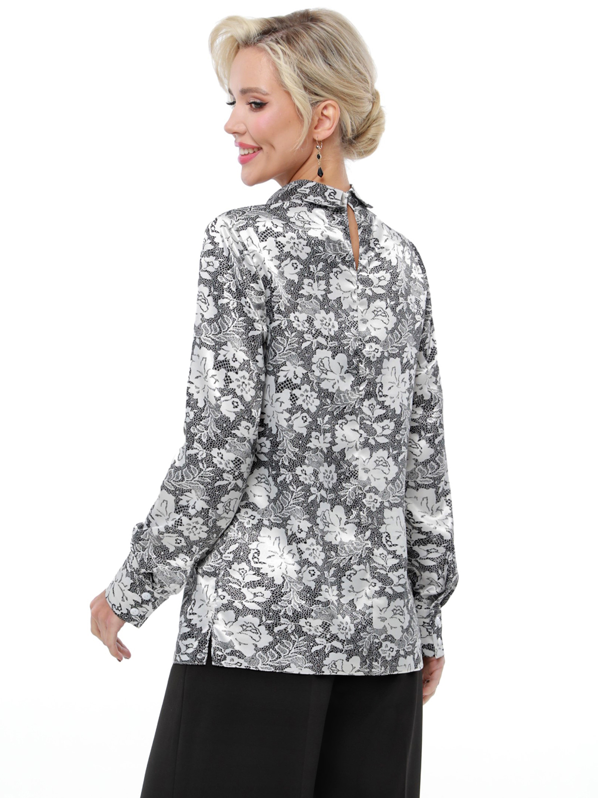 Блузка атласная серая с принтом от бренда SelenaSonata. Модель прямого силуэта, отложной воротник на стойке. Рукава втачные, длинные, на манжете. Практичная модель на любой случай. Рекомендуется бережная стирка при 30 градусах.