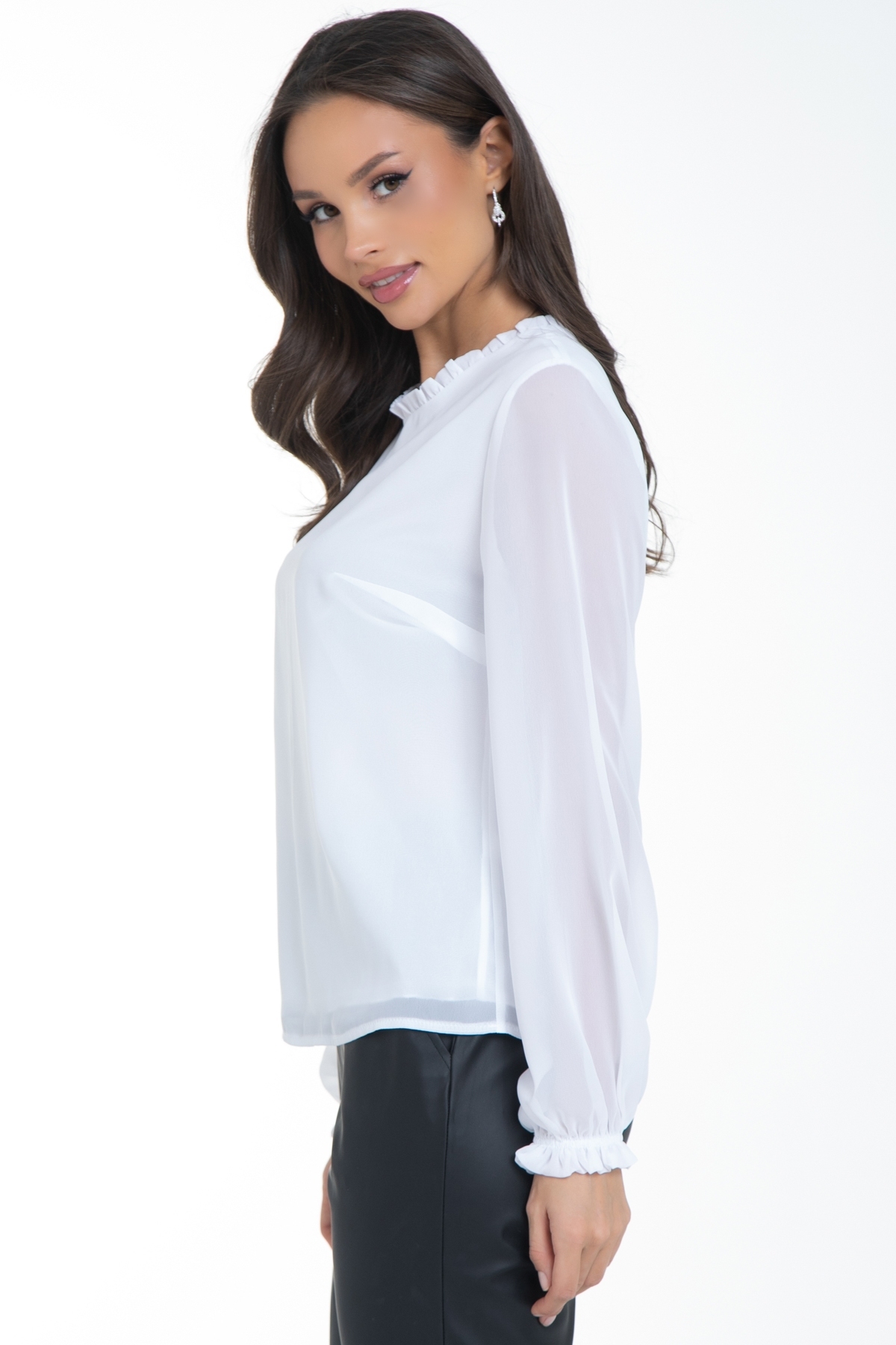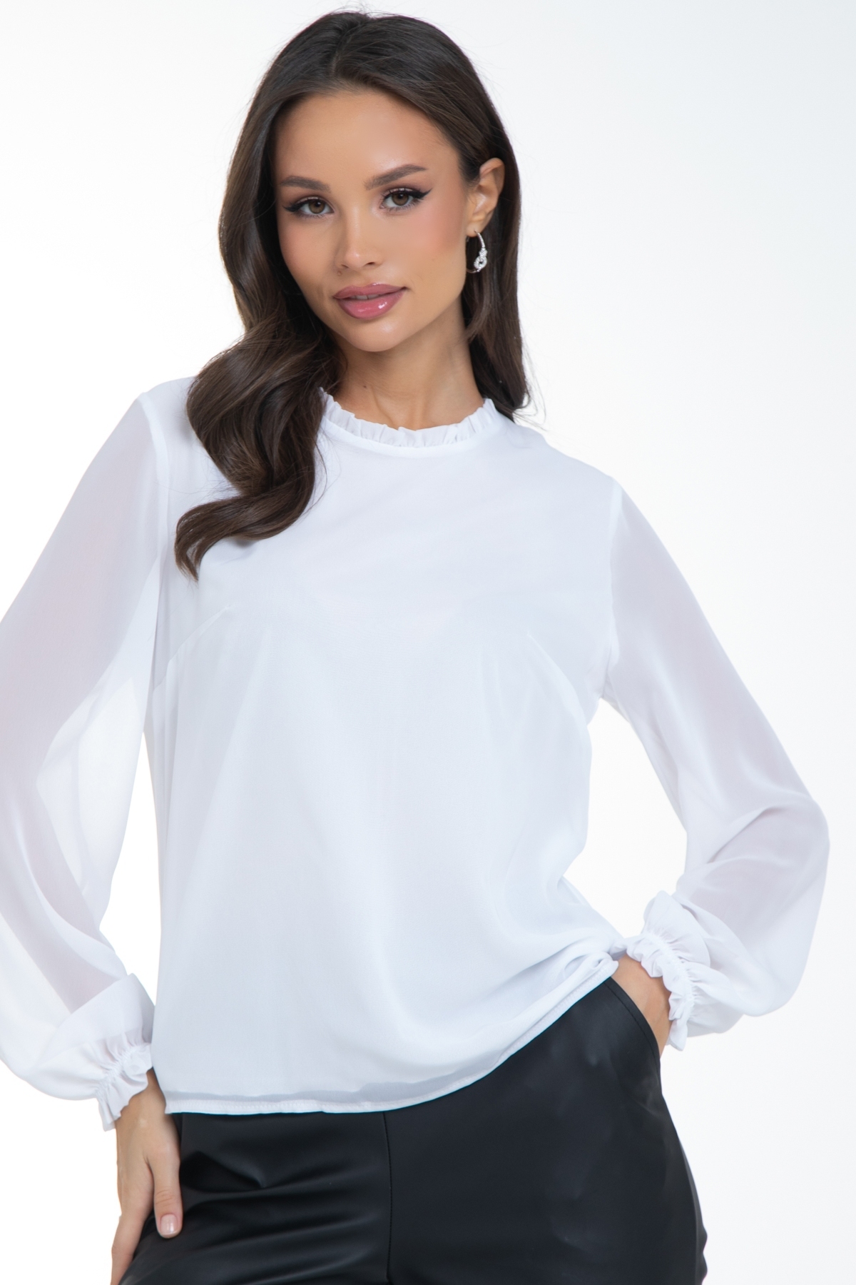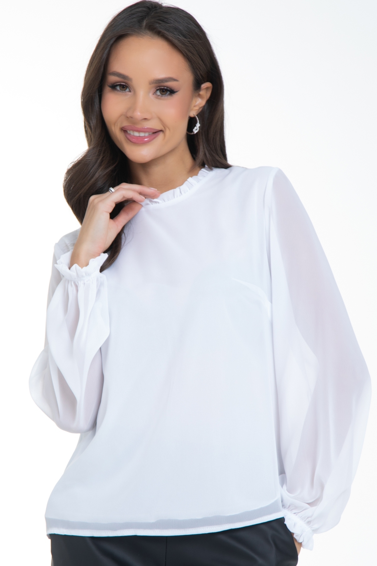 Блузка шифоновая белого цвета от производителя Diolche. Модель свободного силуэта, на трикотажной подкладочной ткани. По переду сделаны вытачки на грудь, рукава длинные втачные пышные, снизу собраны на резинку. Круглая горловина оформлена рюшей с застёжкой на пуговицу на спине. Отличное решение на каждый день или на праздник для современной стильной женщины.