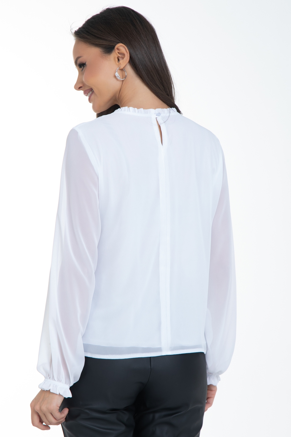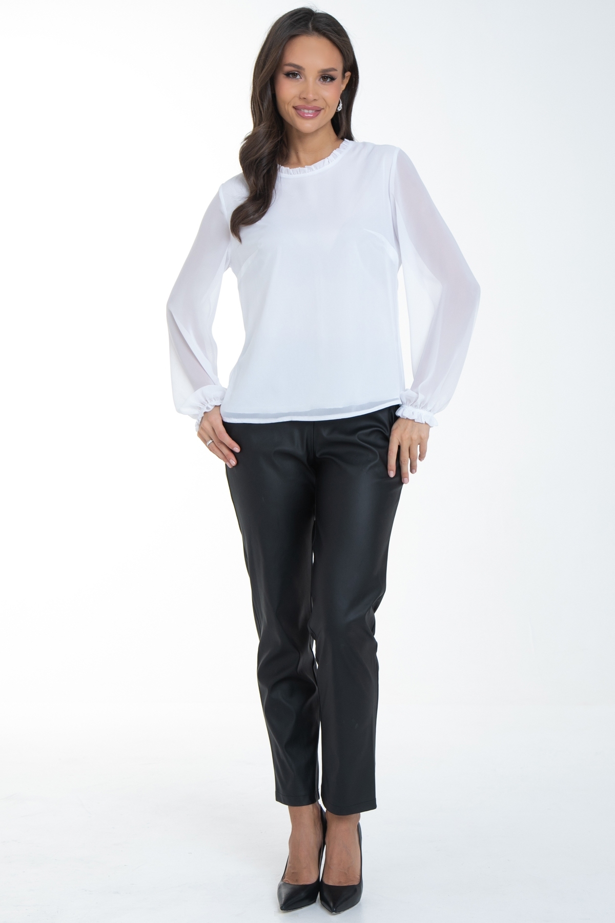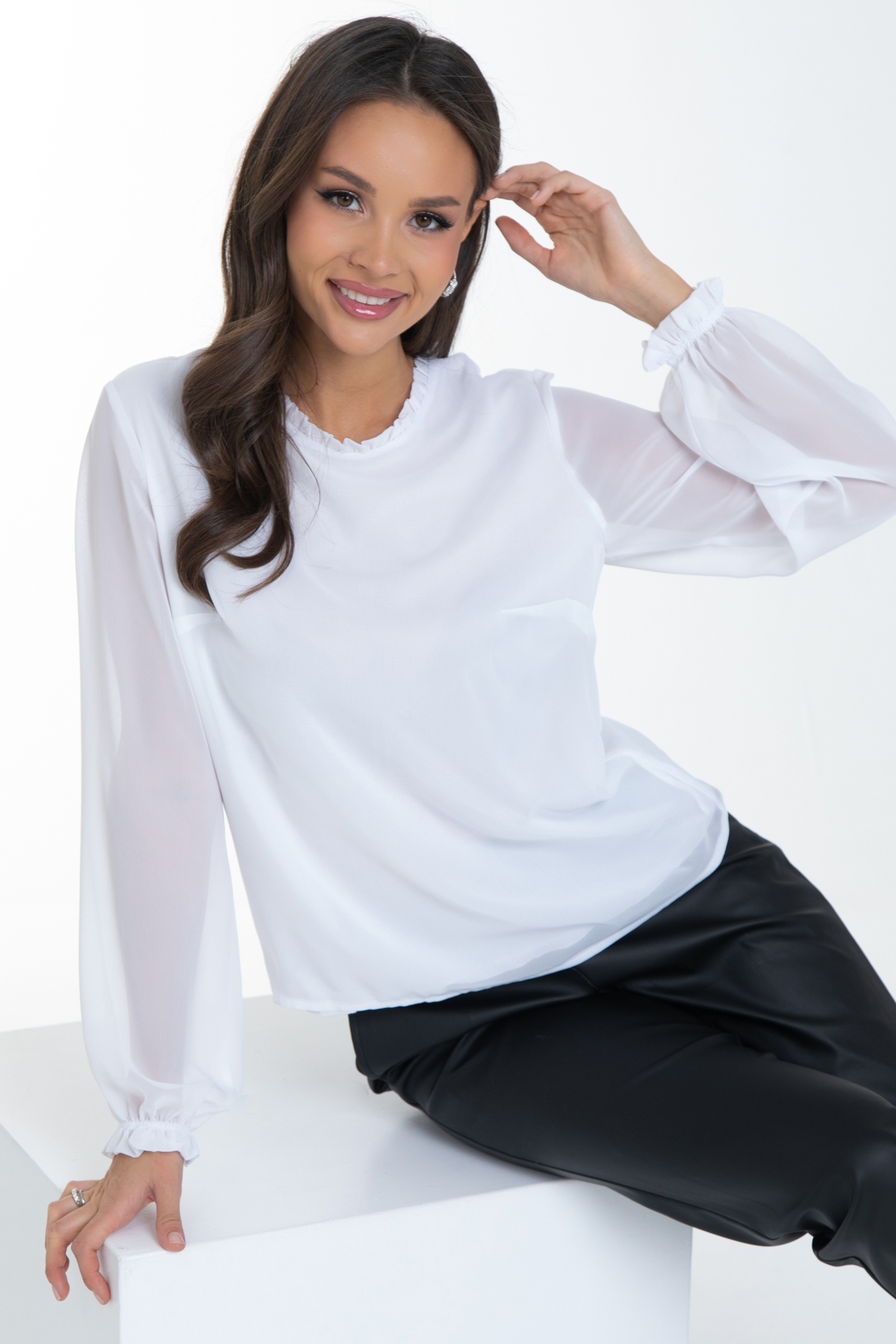 Блузка шифоновая белого цвета от производителя Diolche. Модель свободного силуэта, на трикотажной подкладочной ткани. По переду сделаны вытачки на грудь, рукава длинные втачные пышные, снизу собраны на резинку. Круглая горловина оформлена рюшей с застёжкой на пуговицу на спине. Отличное решение на каждый день или на праздник для современной стильной женщины.