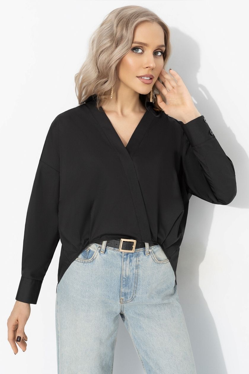 Рубашка чёрная из хлопка от компании Charutti, выполнена из мягкой, воздухопроницаемой ткани. Удлиненный по спинке свободный крой с имитацией запаха позволяет регулировать посадку и корректировать нюансы фигуры. Длинные рукава,V-образный вырез горловины. Для тех, кто любит фантазию в базовом гардеробе.