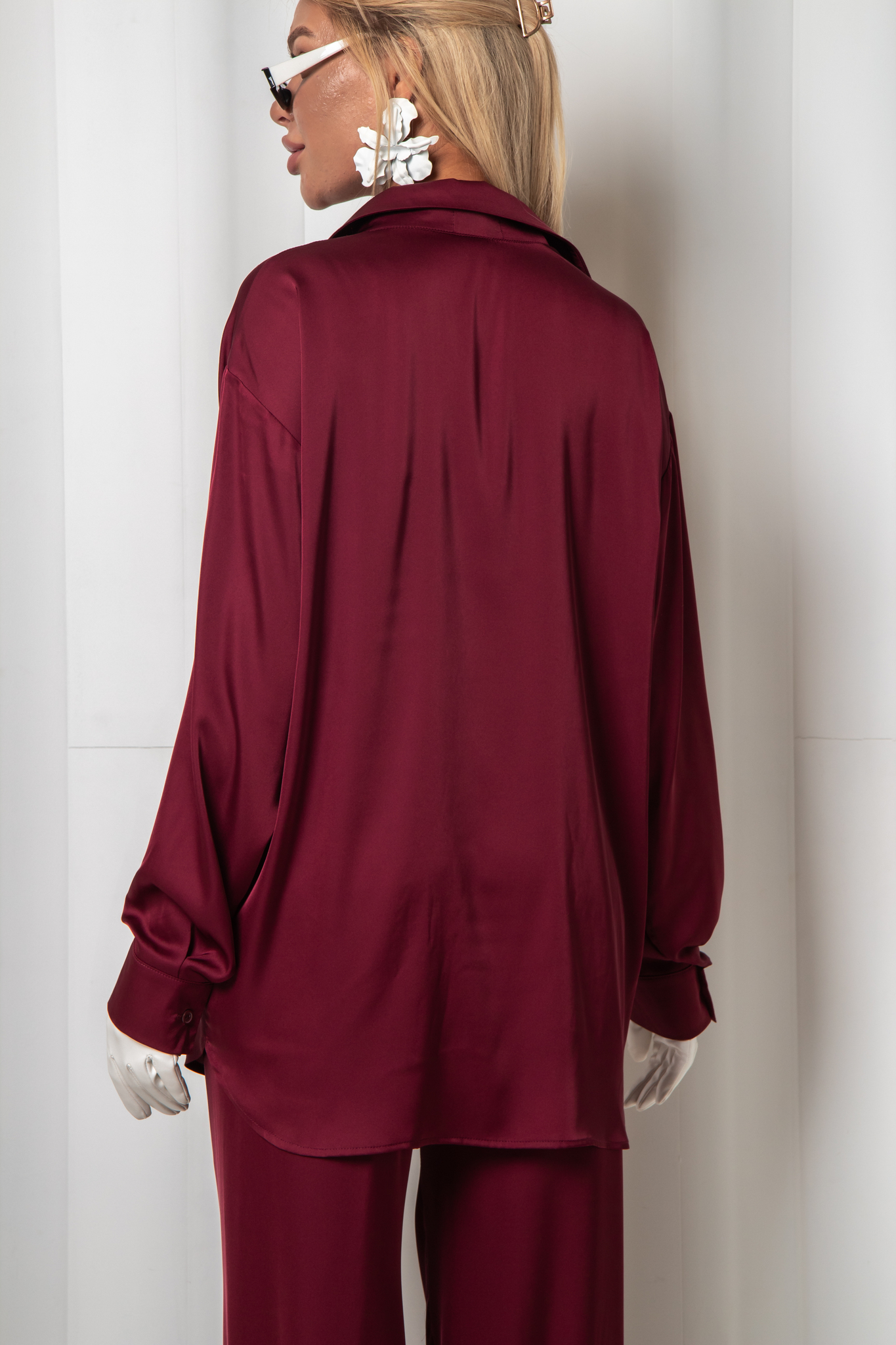 Рубашка бордовая с длинными рукавами от бренда Kosmos. Модель силуэта оверсайз, выполнена из дубайского шелка со спущенной линией плеча, широкими манжетами на пуговицах. Застёгивается на пуговицы. Универсальный вариант на каждый день.