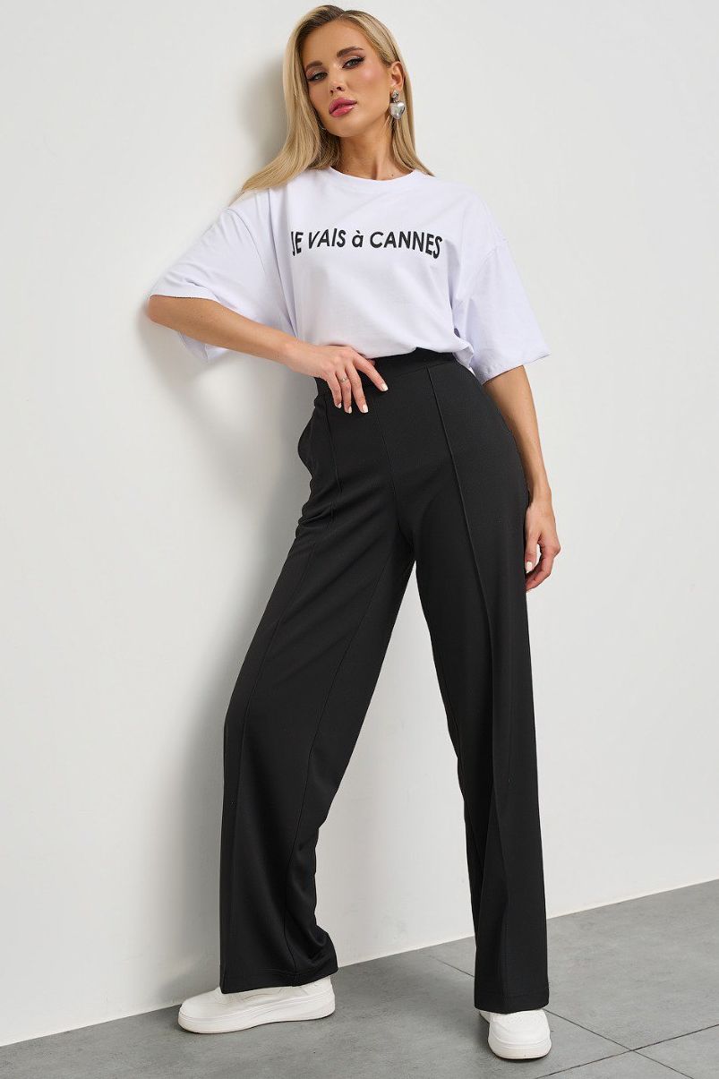 Брюки трикотажные чёрные с карманами от производителя Jetty. Модель широкого силуэта с застроченными стрелками. Притачной пояс на резинке. Идеальное решение для Вашего стильного гардероба.