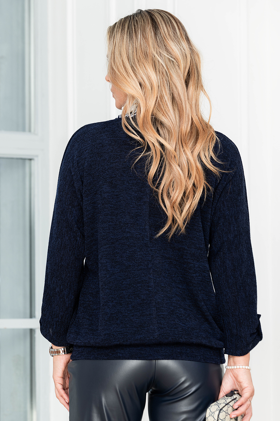 Джемпер трикотажный тёмно-синего цвета от компании Lavira. Модель свободного силуэта, горловина оформлена круглым вырезом с воротником "хомут" из шифона. Цельнокроеный, длинный рукав. По низу изделия притачной пояс. Прекрасный выбор на каждый день.