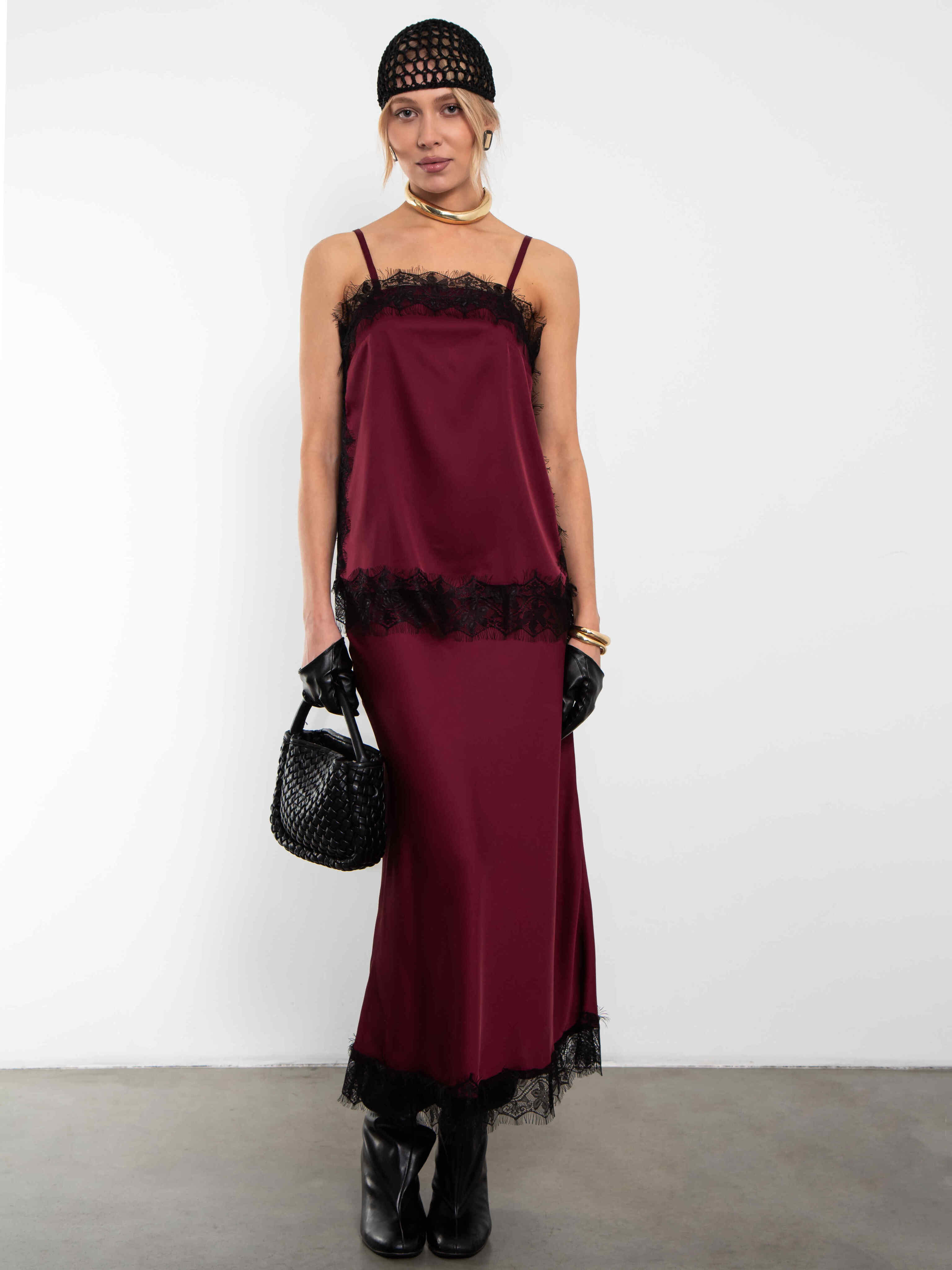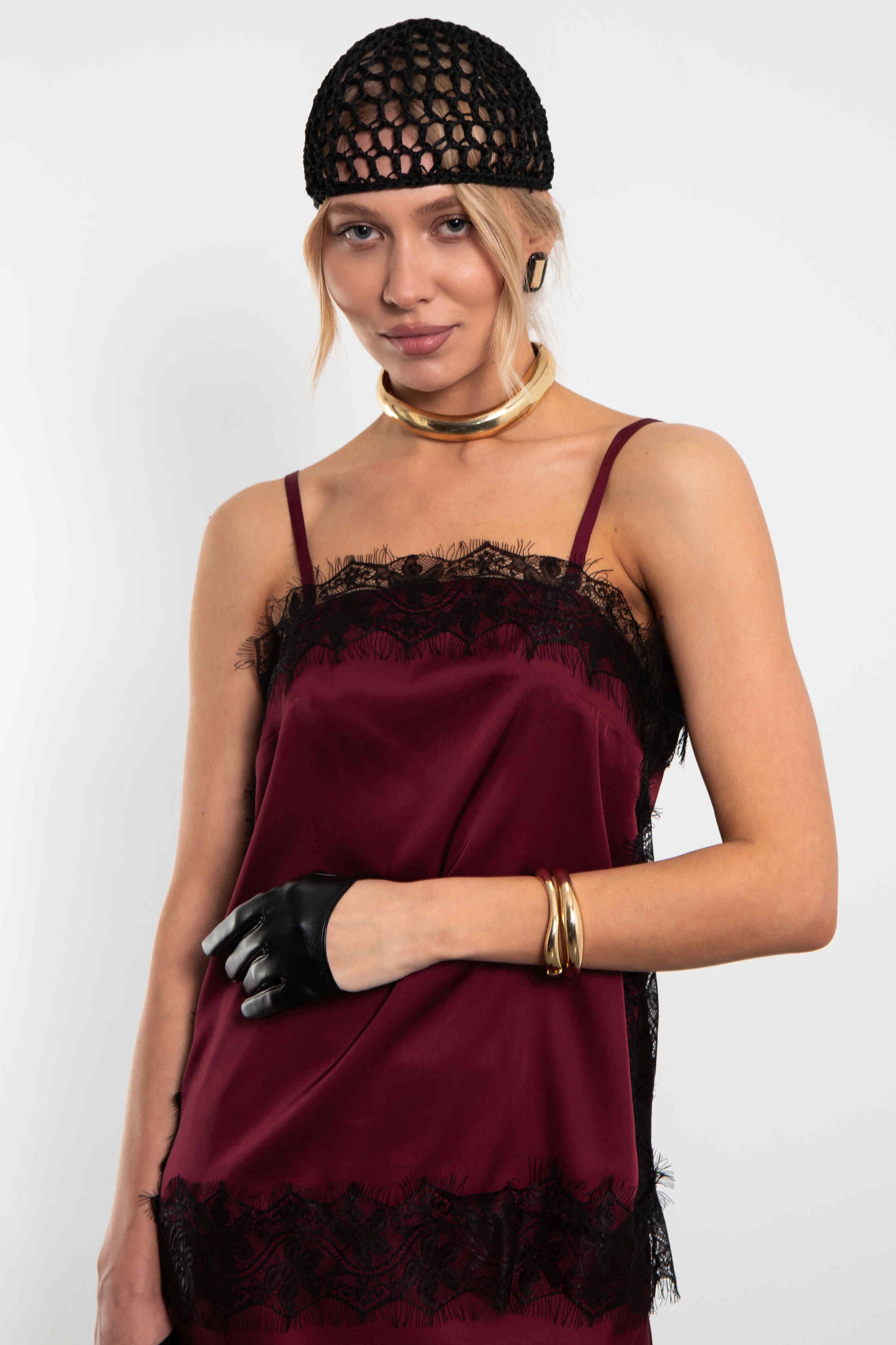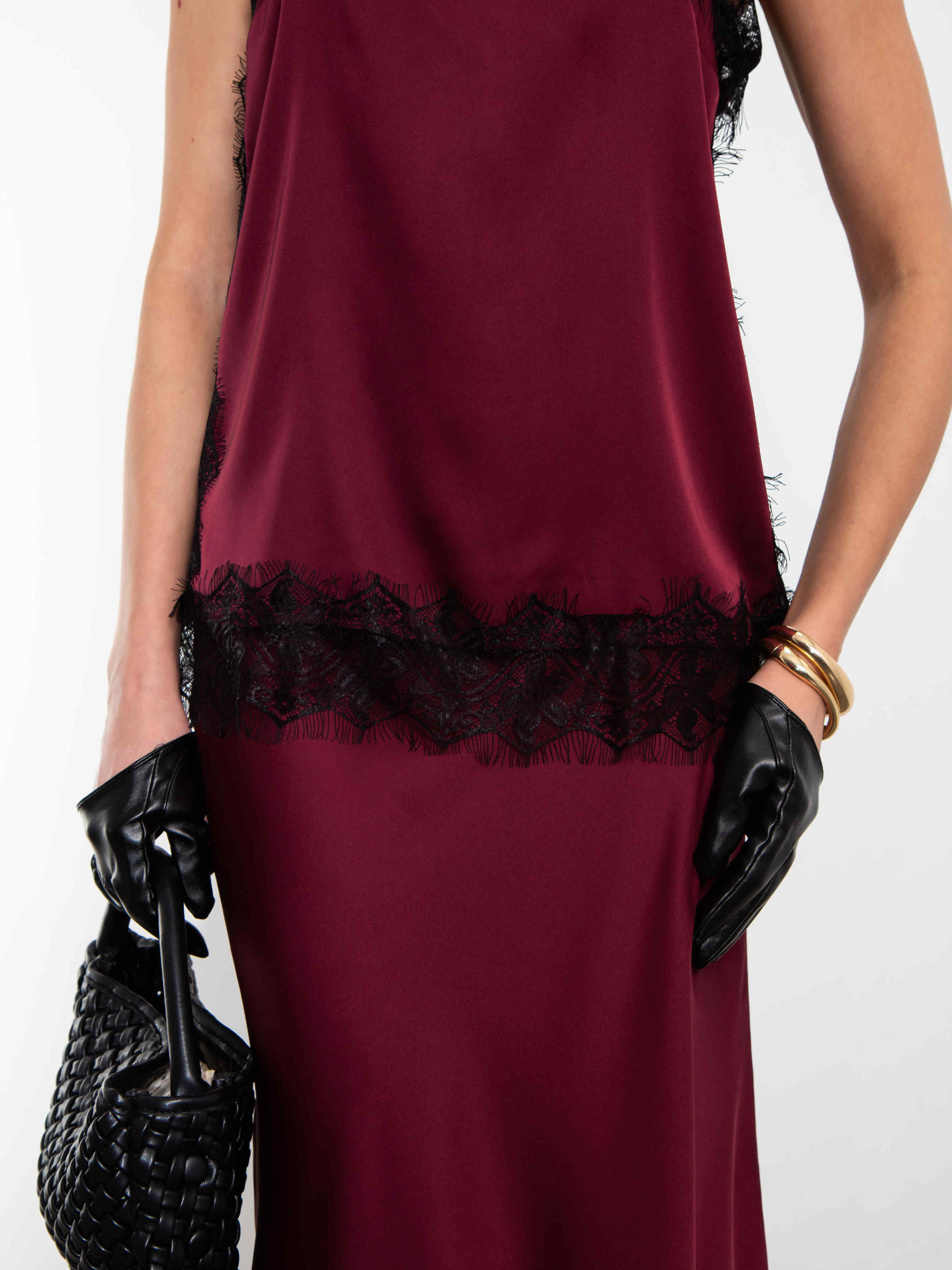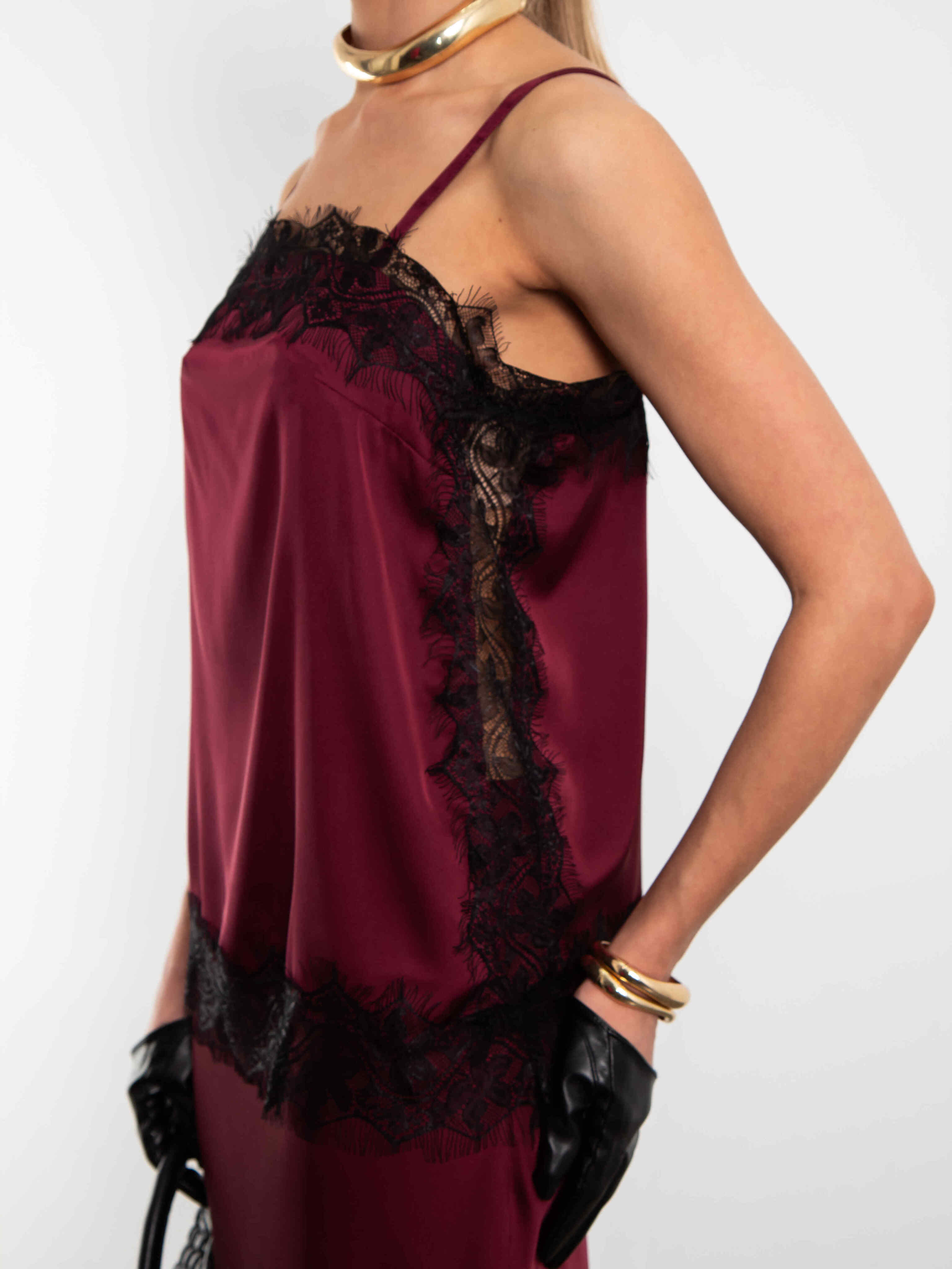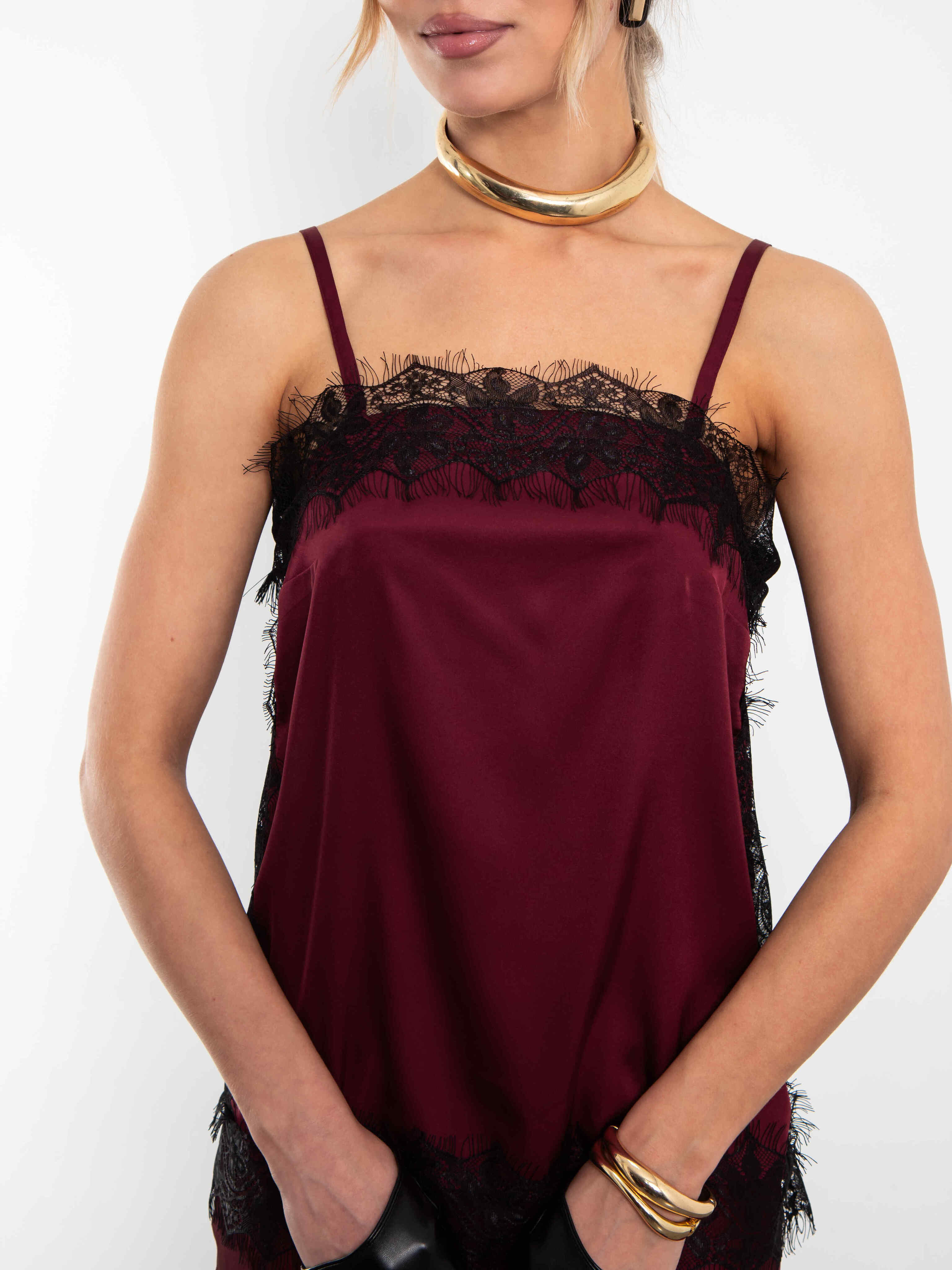 Топ бордовый в бельевом стиле на тонких бретелях с кружевом