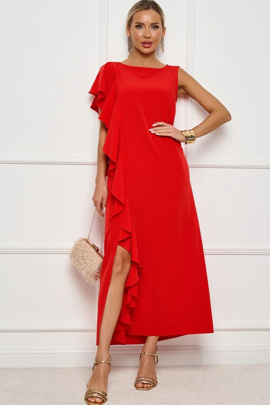 Платье длинное красное с воланом от производителя Jetty. Модель прямого силуэта, выполнена из плательного полотна. Перед и спинка с одной стороны изделия декорированы пришивным воланом, который мягко ложится на плечо и имитирует рукав. НИз дополнен разрезом. Прекрасно дополнит Ваш гардероб для любого мероприятия.