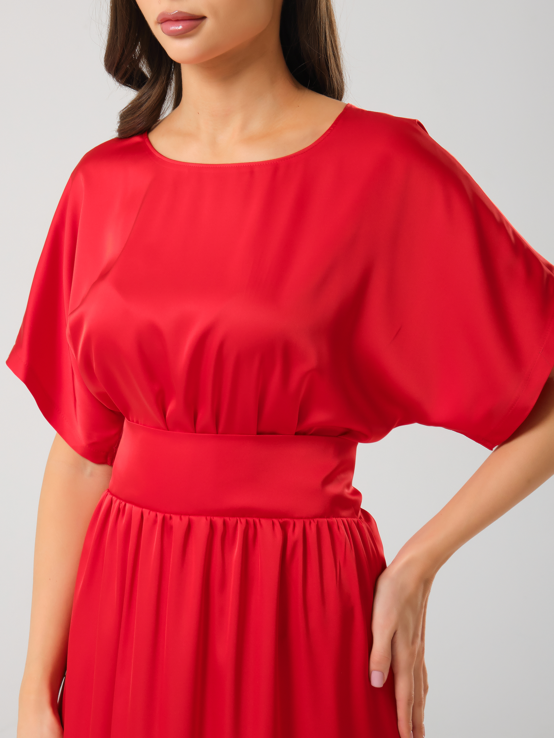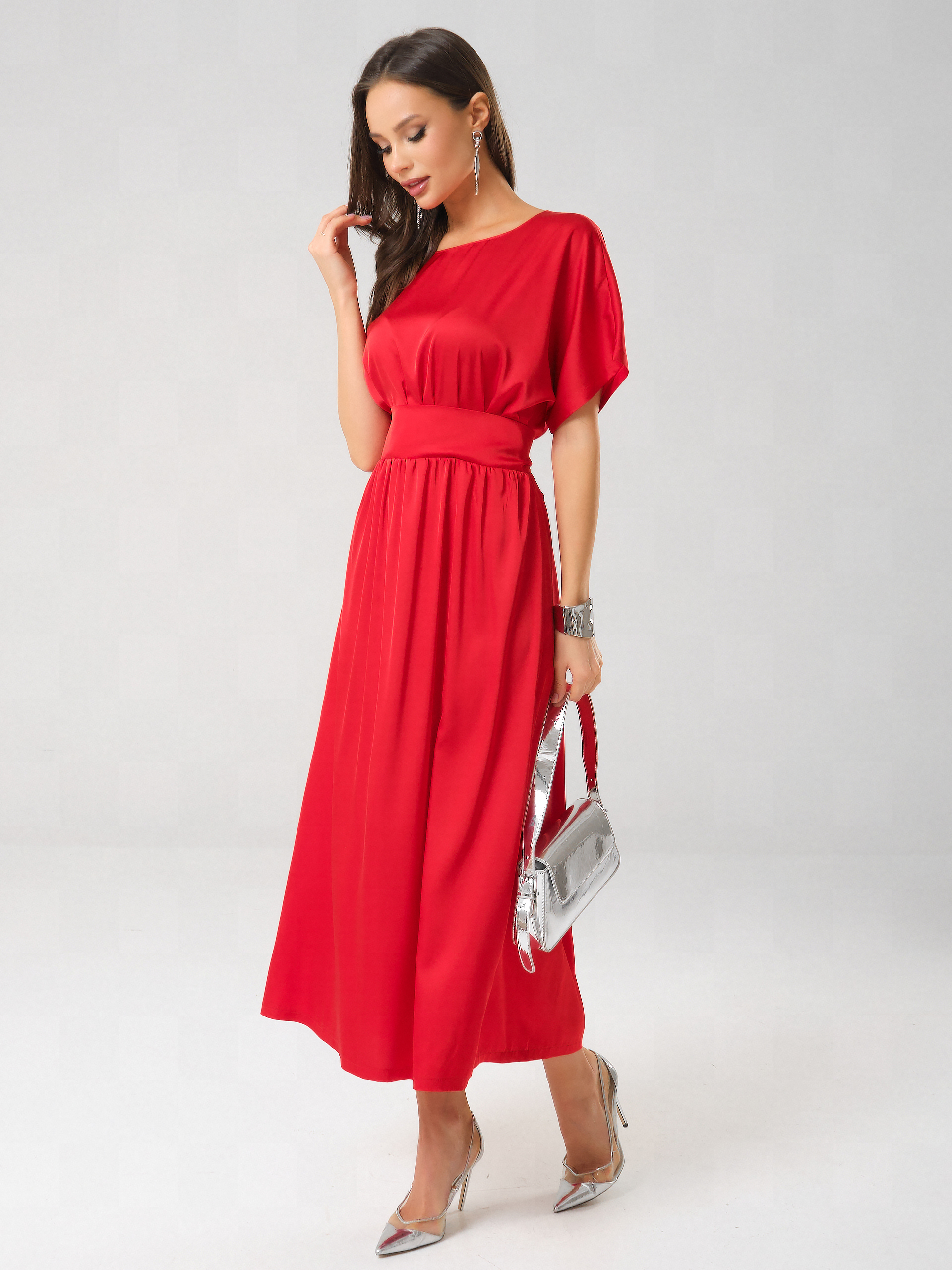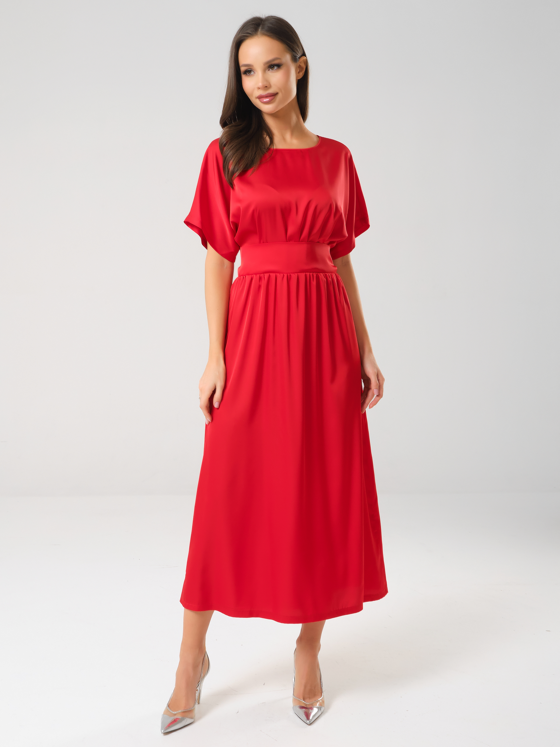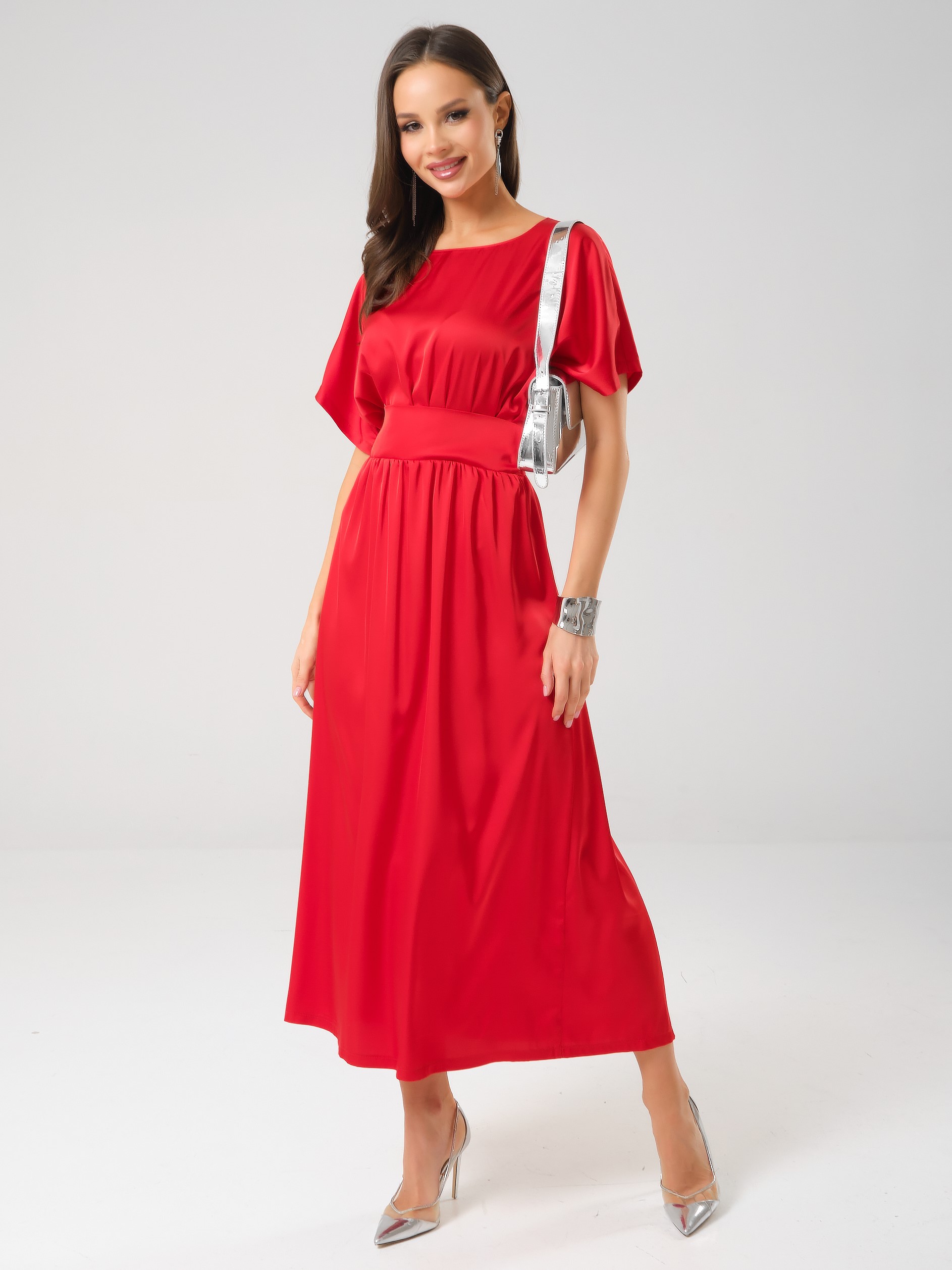 Платье нарядное красное с широким поясом от торгового дома Priz, выполнено из текстильного полотна. Перед с отрезной линией талии, со сборкой. Рукав цельнокроеный. Горловина окантована. Сзади по горловине заложена складка. Элегантность и стиль в одной модели.