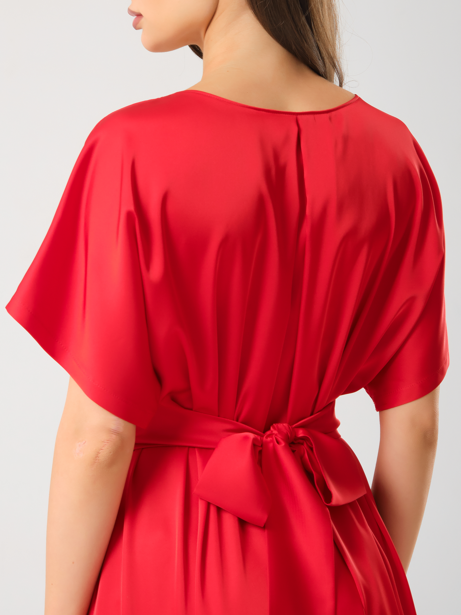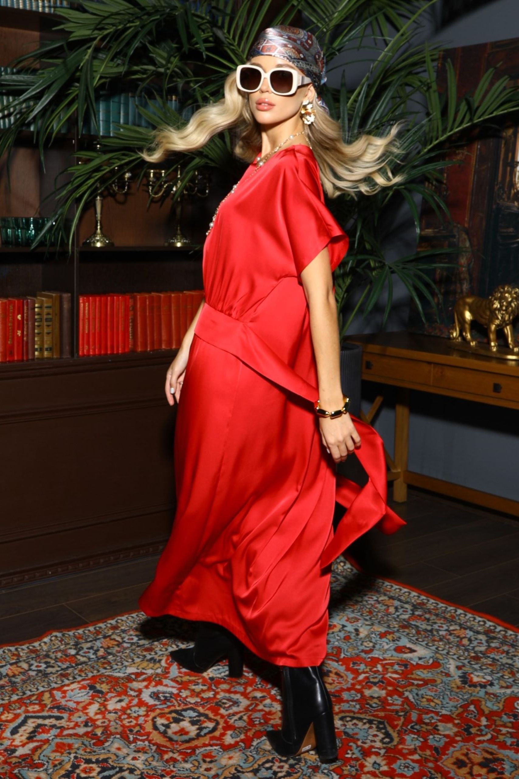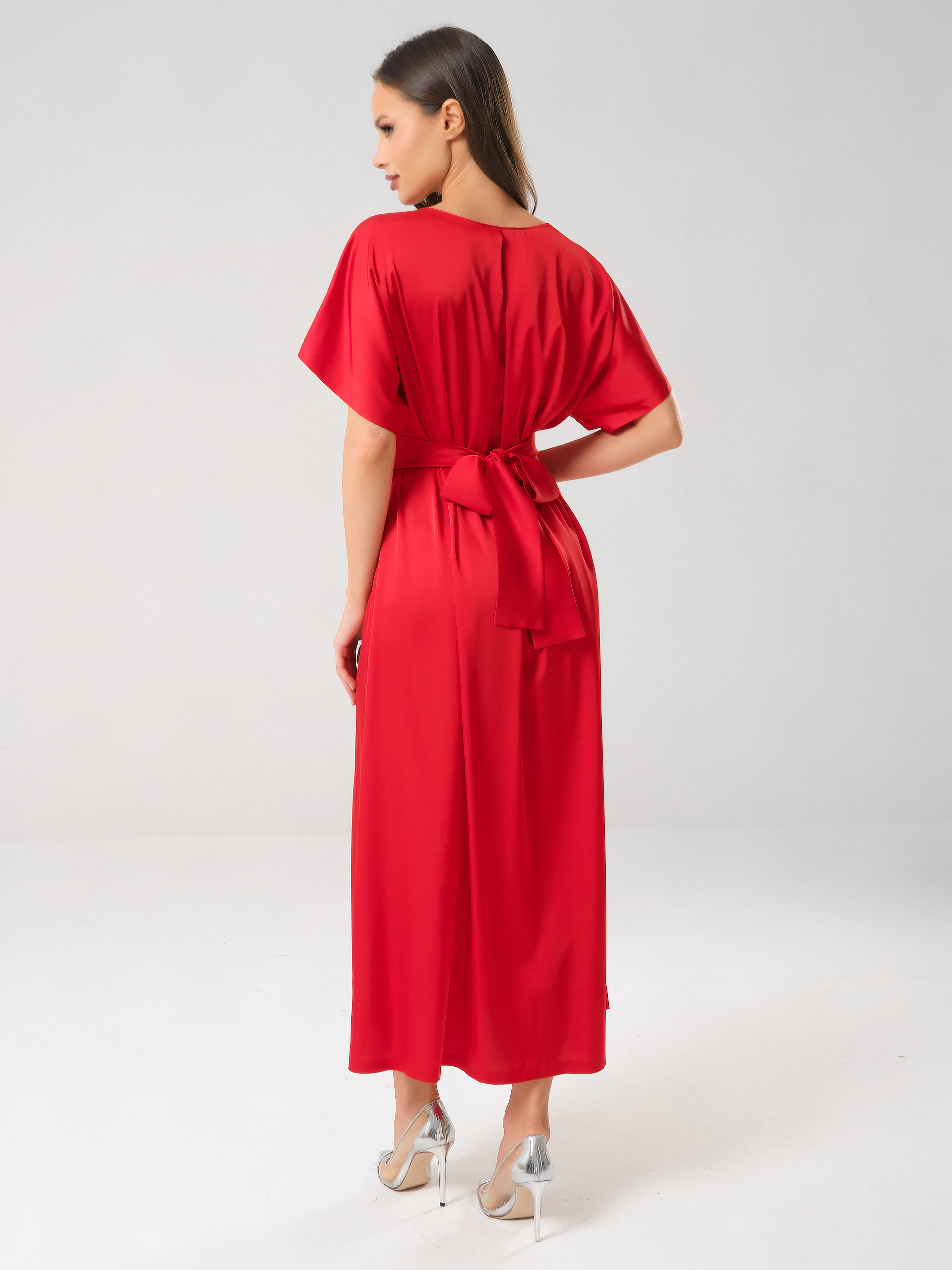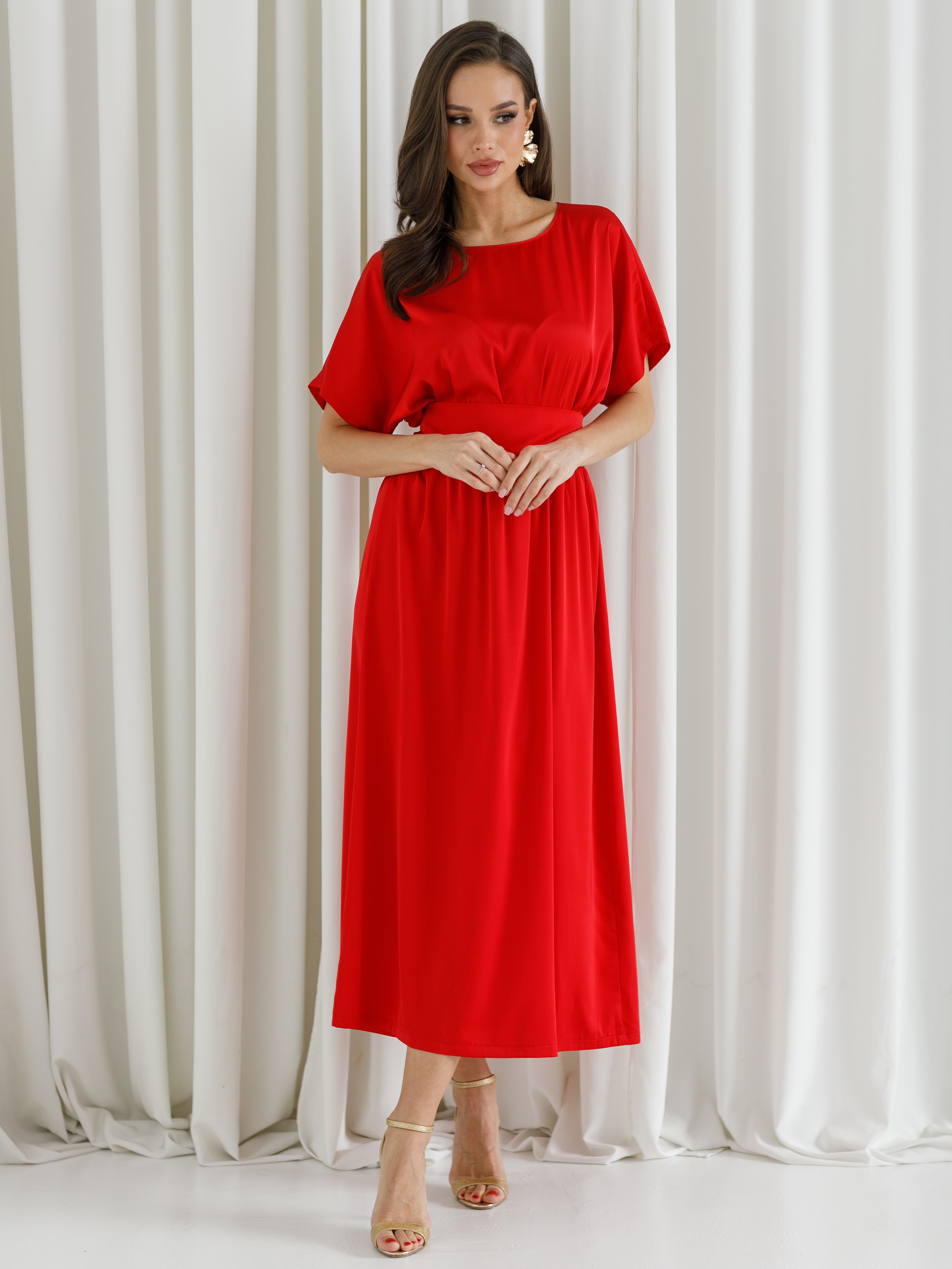 Платье нарядное красное с широким поясом от торгового дома Priz, выполнено из текстильного полотна. Перед с отрезной линией талии, со сборкой. Рукав цельнокроеный. Горловина окантована. Сзади по горловине заложена складка. Элегантность и стиль в одной модели.