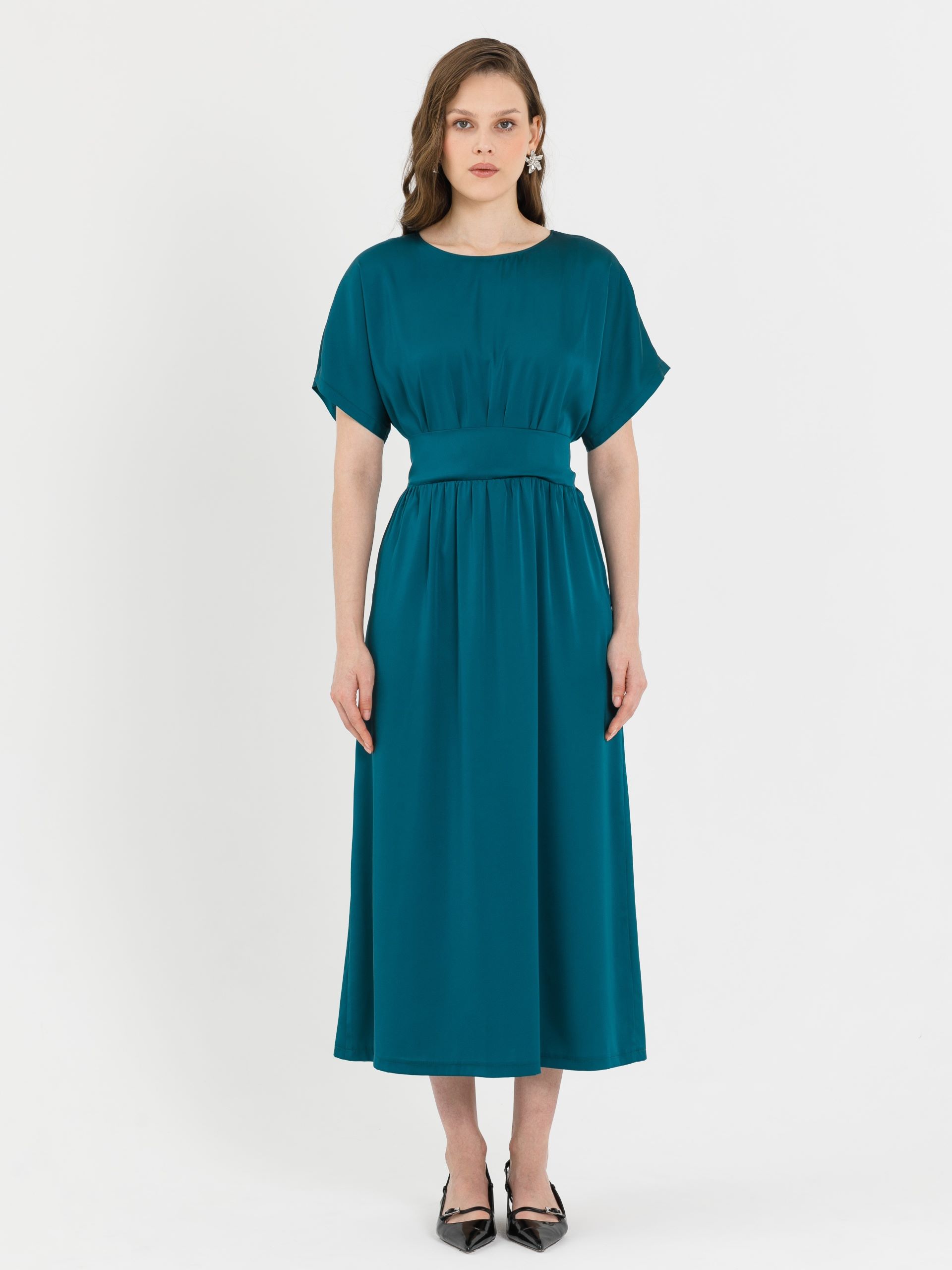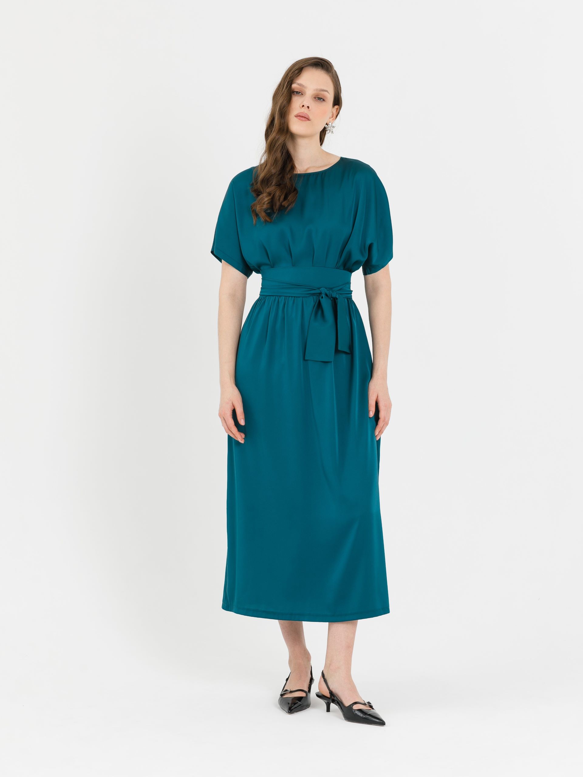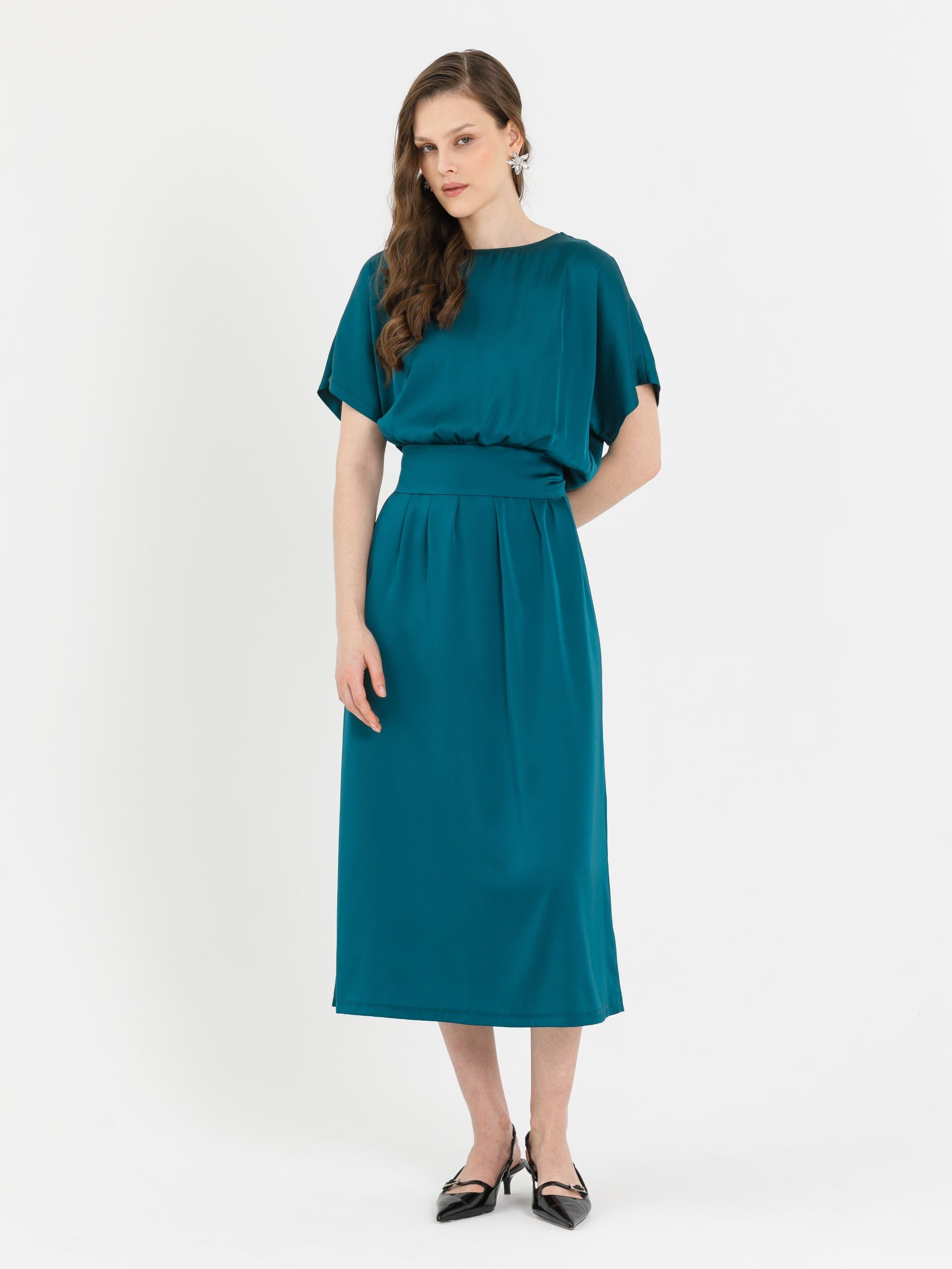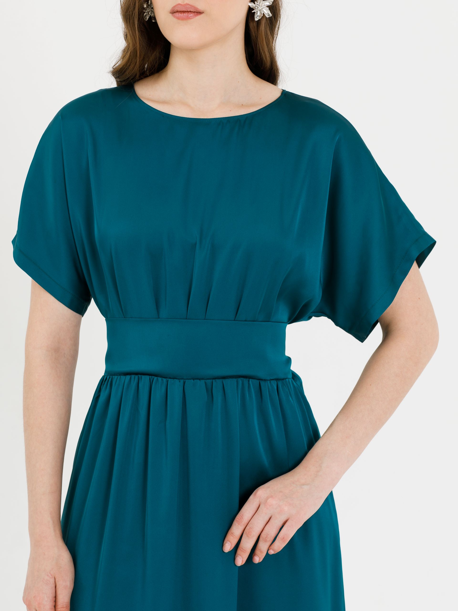 Платье нарядное с широким поясом от торгового дома Priz, выполнено из текстильного полотна в цвете малахитовый зелёный. Перед с отрезной линией талии, со сборкой. Рукав цельнокроеный. Горловина окантована. Сзади по горловине заложена складка. Элегантность и стиль в одной модели.
