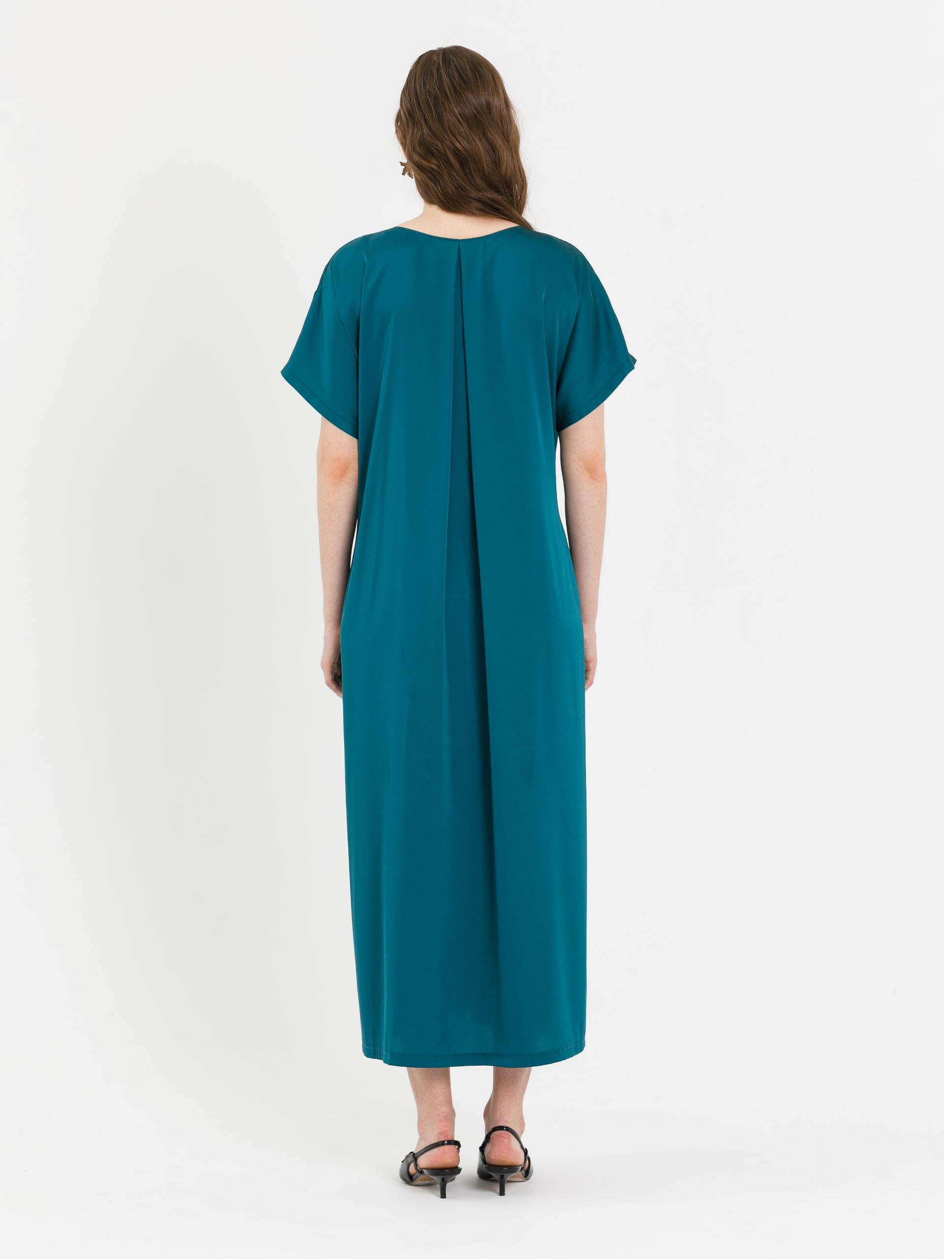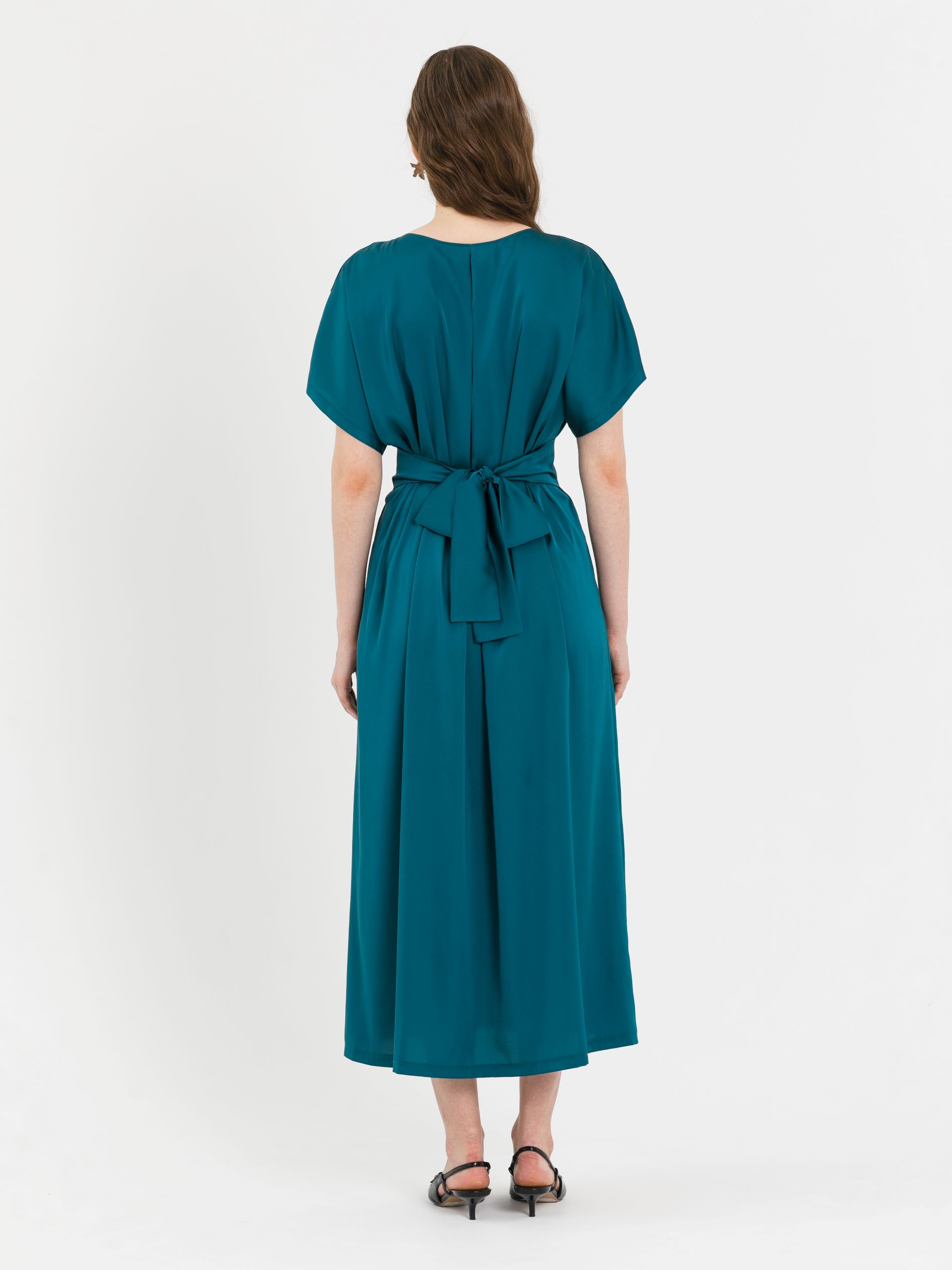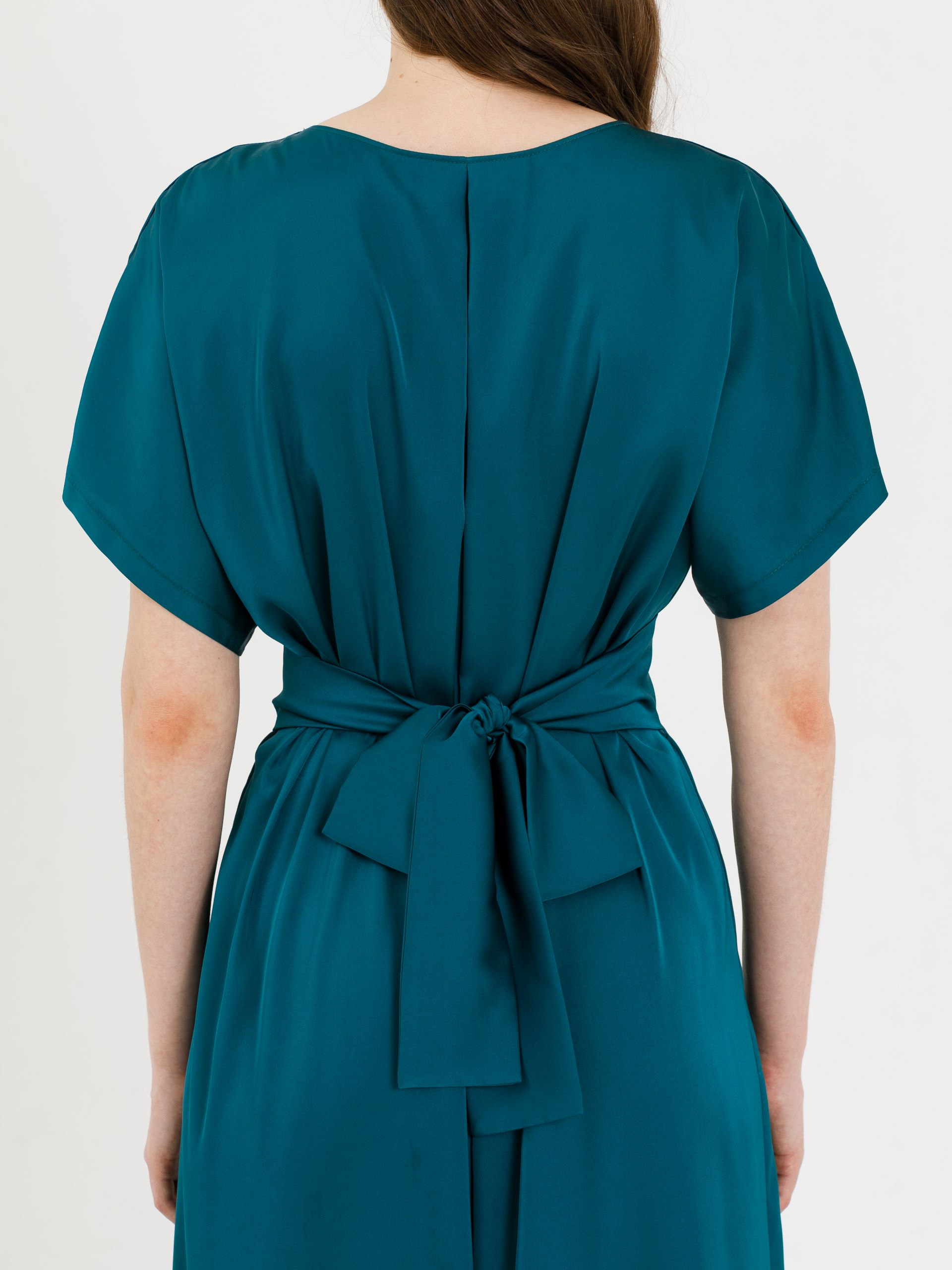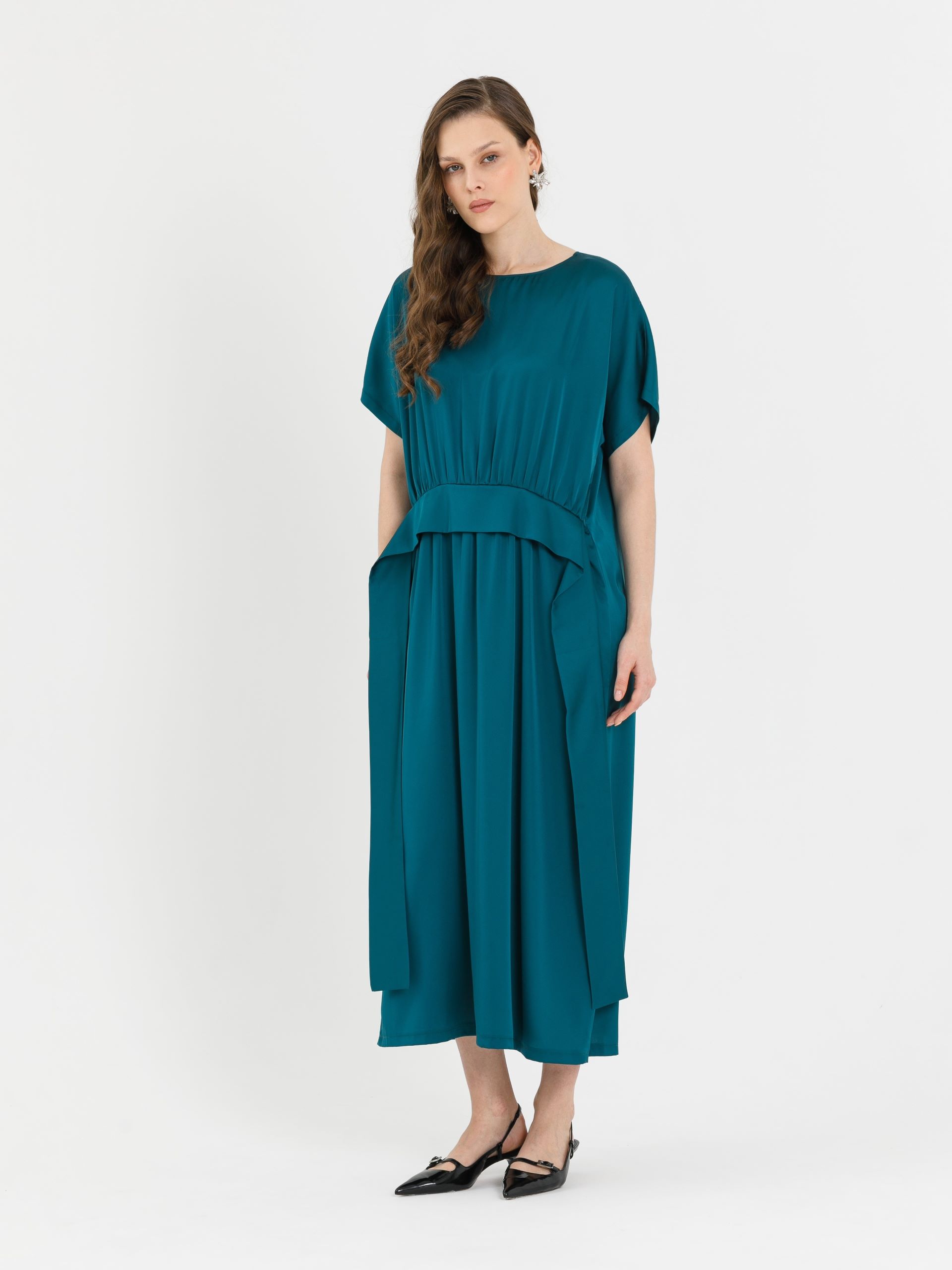 Платье нарядное с широким поясом от торгового дома Priz, выполнено из текстильного полотна в цвете малахитовый зелёный. Перед с отрезной линией талии, со сборкой. Рукав цельнокроеный. Горловина окантована. Сзади по горловине заложена складка. Элегантность и стиль в одной модели.
