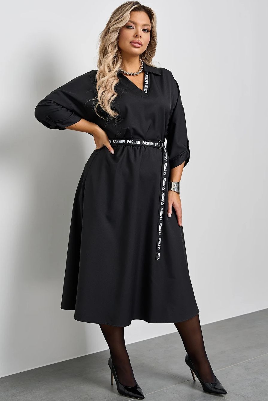 Платье чёрное с карманами от бренда Jetty. Модель свободного силуэта с удлиненной юбкой, выполнена из плательного полотна. V-образный вырез горловины с отложным воротником, украшен декоративной лентой. Цельнокроеные укороченные рукава с патой. Линия талии собрана на резинку. Тканевый пояс идёт в комплекте. Идеальный выбор для Вашего стильного гардероба.