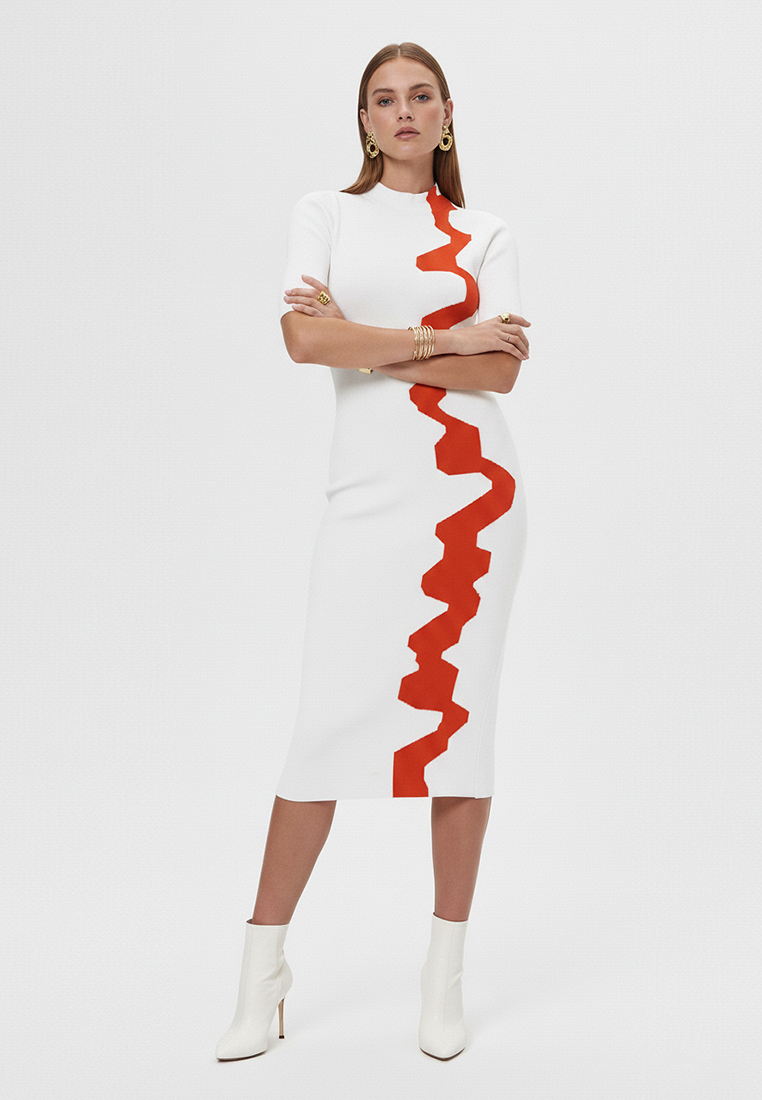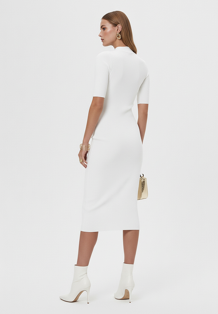 Платье-футляр вязаное молочного цвета от компании Happychoice. Модель прилегающего силуэта, рукав втачной короткий прямой. Вырез горловины круглый с невысоким воротником "стойкой" без застёжки. Платье гарантирует Вам тепло и уют в прохладные дни и станет вашим надежным спутником, идеально сочетая в себе комфорт и функциональность.