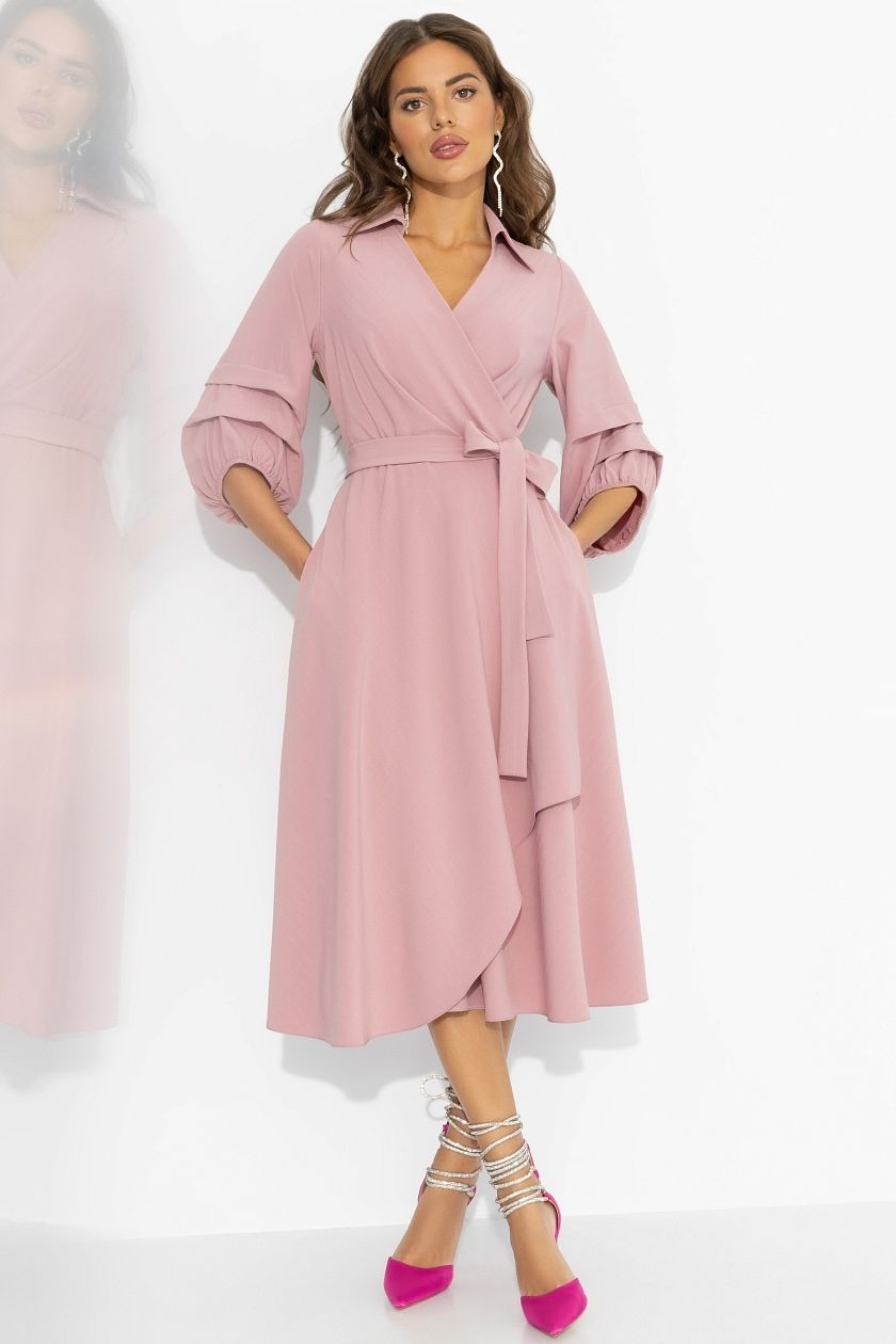 Платье розовое на запах от компании Charutti. Модель полуприлегающего силуэта, на запах, выполнена из костюмной ткани стрейч. V-образный вырез горловины с отложным воротником. Втачной рукав 3/4, собран на резину. В комплекте пояс из основной ткани. Это Ваш отличный образ, в котором вы всегда чувствуете себя уверенно.
