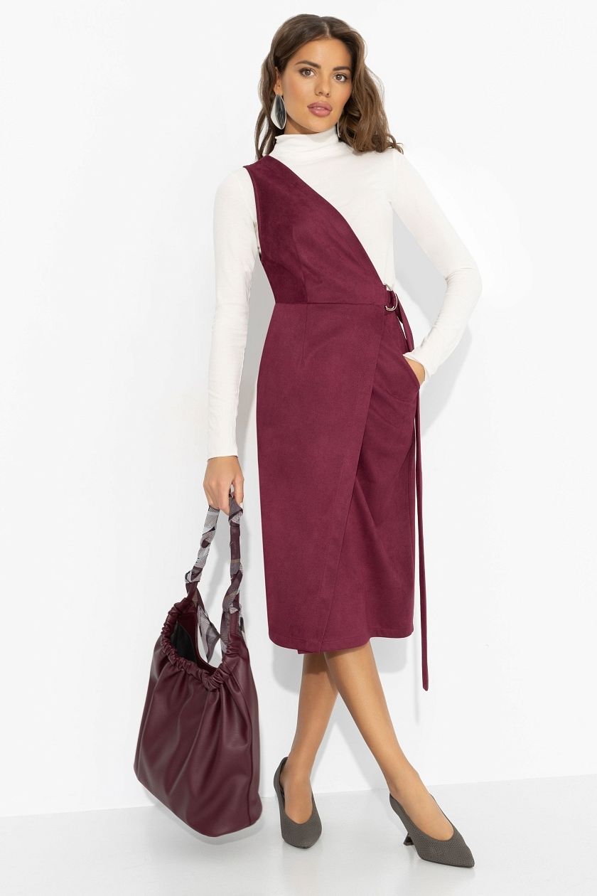 Сарафан замшевый бордового цвета от компании Charutti. Модель полуприлегающего силуэта, V-образный вырез горловины на запах. Без рукавов с одной лямкой. Отрезное по линии талии с завязками. По бокам удобные карманы. Идеальный выбор для создания неповторимого повседневного образа.