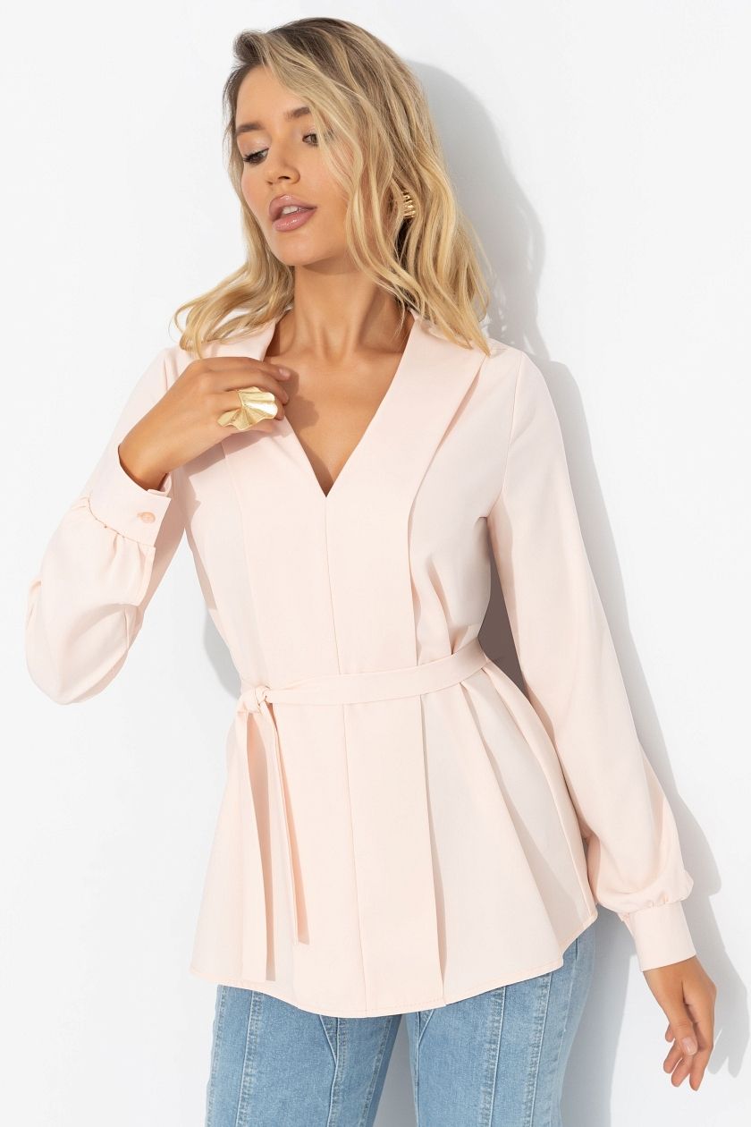 Блузка персикового цвета из плотного материала "гальяно" от компании Charutti. Модель свободного силуэта, V-образный вырез горловины. Втачные длинные рукава, на манжете. Низ изделия закруглён. В комплекте пояс из основной ткани. Идеальный выбор для Вашего стильного гардероба.