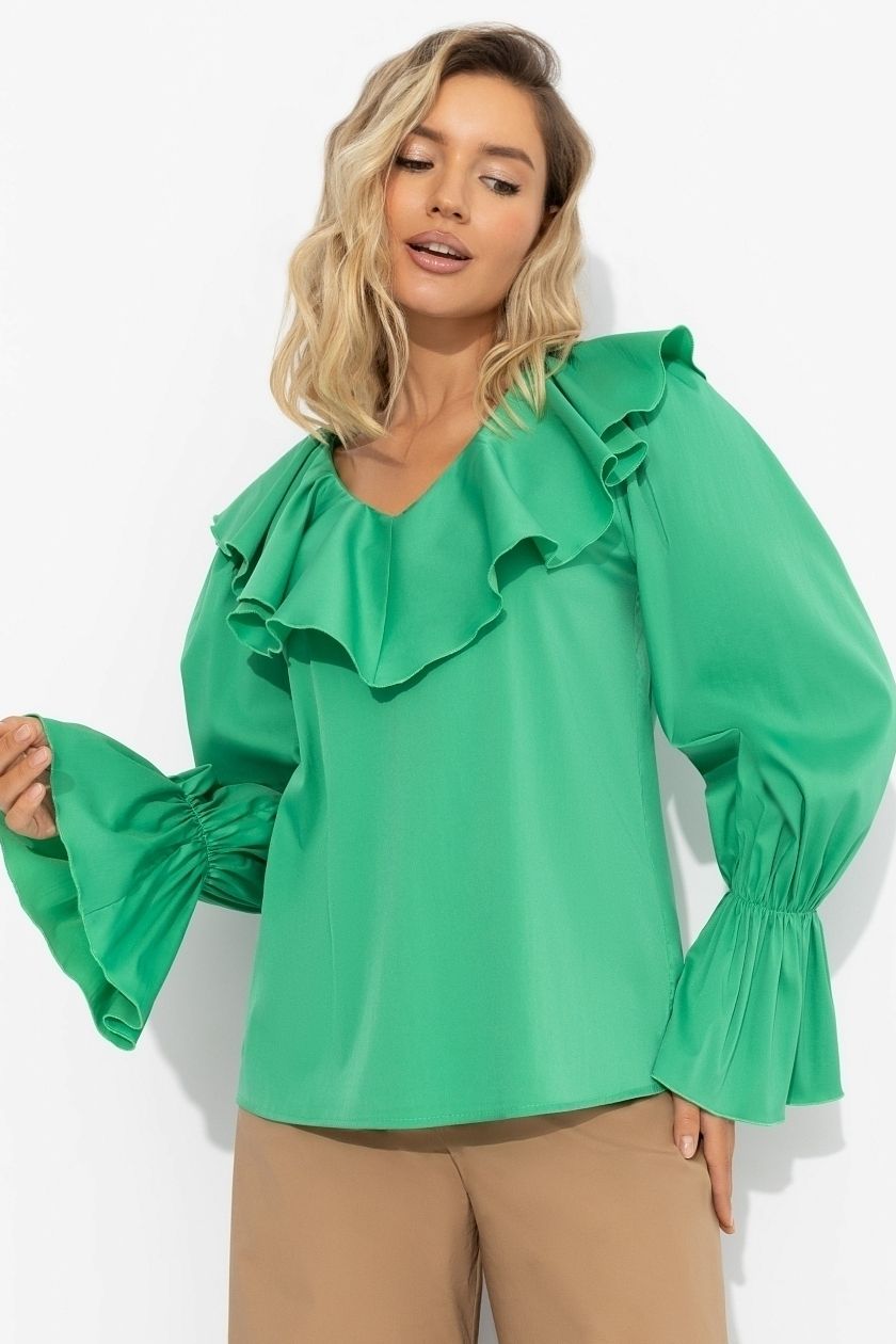 Блузка зелёная в стиле бохо с рюшами от компании Charutti. Модель прямого кроя, выполнена из сатин сити. Зона выреза спереди и сзади дополнена объемными рюшами. Края рюш обработаны. Рукава оформлены тонкой скрытой резинкой. Изделие хорошо смотрится в заправленном виде и навыпуск. Прекрасное решение для создания романтичного образа.