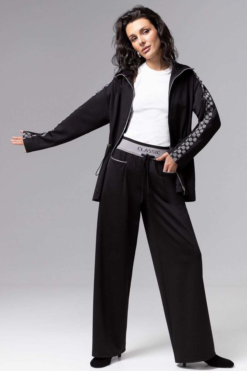 Брюки чёрные на широкой резинке от компании Charutti, выполнены из костюиного полотна. Невесомый материал струится, оставляя точку притяжения взглядов на талии – акцентная широкая резинка безупречно прилегает к телу. Эстетика деталей вшита в брюки – тонкая шнуровка на поясе и изящные линии карманов. Брюки широкие. Посадка высокая на талии. Выверенный крой изделия. Есть симметричные карманы. Идеальный выбор для городских модниц.