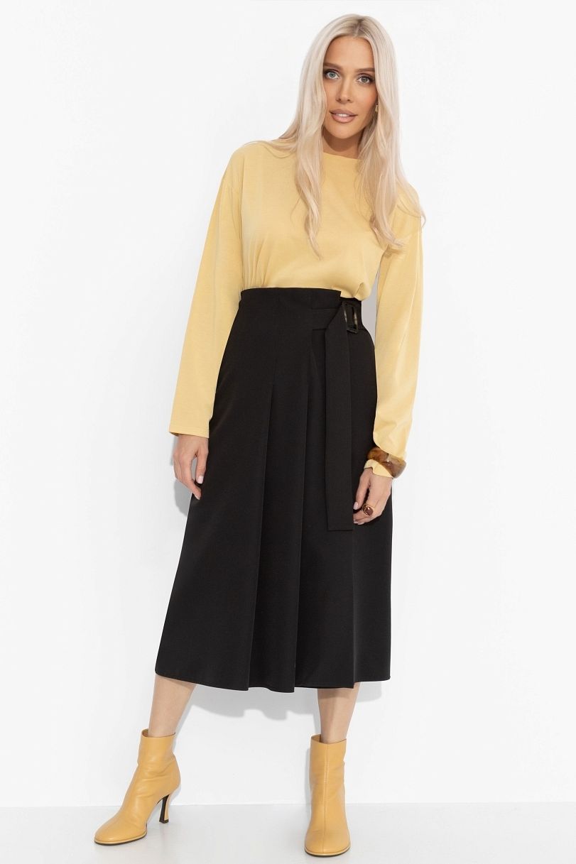 Юбка чёрная на запах от компании Charutti, выполнена из костюмного полотна "барби". Акцентный асимметричный пояс вшит. Деликатная сборка по длине изделия. Есть разрез за счет запаха. Этот универсальный элемент одежды легко сочетается с различными блузками и топами, позволяя создавать как повседневные, так и более торжественные образы.