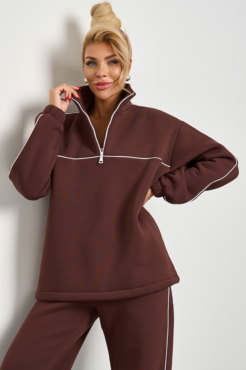 Свитшот свободный трикотажный от компании Jetti. Модель свободного силуэта, выполнена из плотного премиум-футера 3-х нитка с начесом в цвете шоколад. По переду изделия и вдоль рукава выполнена отделка декоративным контрастным кантом. Линия плеча спущенная. Длинный рукав на манжете и резинкой внутри манжета. Воротник - стойка на молнии. По низу иделия вставлена резинка с регулятором объема. Стильный образ для повседневной носки.