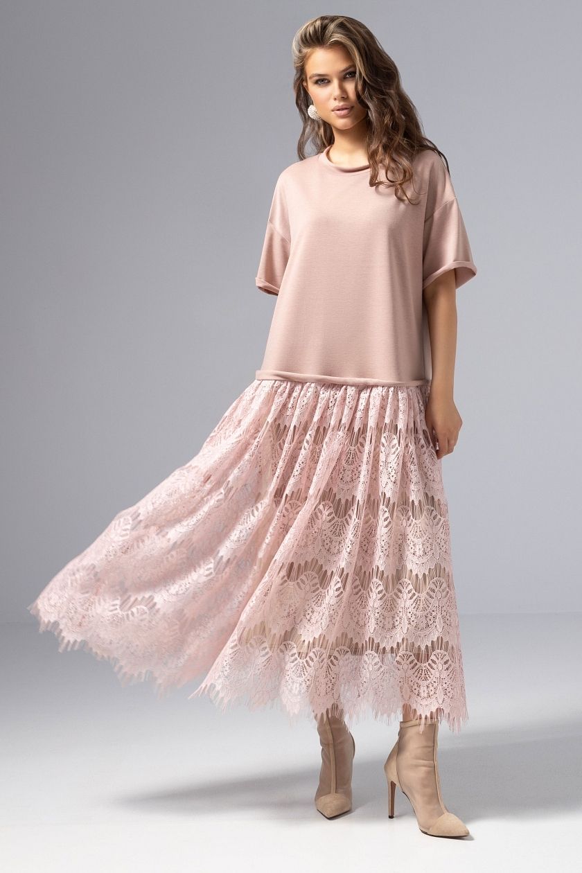 Платье комбинированное с кружевом розового цвета от компании Charutti. Модель полуприлегающего силуэта. Круглый вырез горловины. Рукава короткие. Юбка с подкладом. Прекрасный вариант для торжественного мероприятия.
