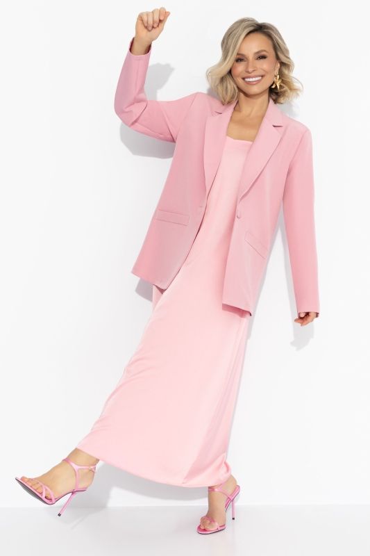Костюм-двойка розовый от компании Charutti. Состоит из однобортного жакета, выполненного из костюмного полотна "барби", свободного кроя и сарафана из шёлка "Армани". Жакет с лацканами, застегивается на пуговицу в тон изделия. Имитация карманов. Сарафан на тонких бретелях. Хорошо смотрится на любом типе фигуры. Отличный выбор для создания романтичного образа.