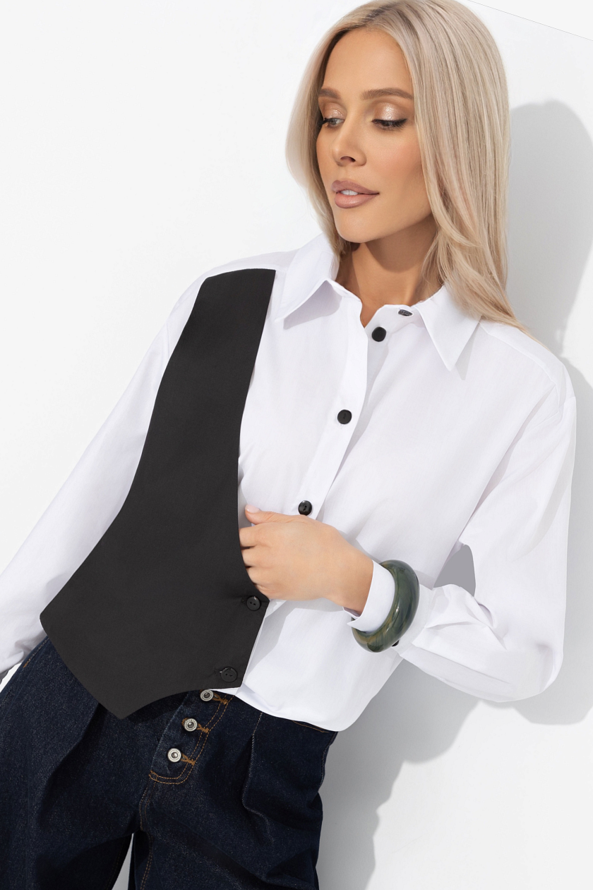 Рубашка белая из хлопка от компании Charutti. Модель удлиненная прямого силуэта. Акцентные детали по одной стороне изделия прошита. Имитация части жилета. Изделие застегивается на пуговицы контрастного цвета. Можно носить в заправленном виде. Идеальный выбор для городских модниц.