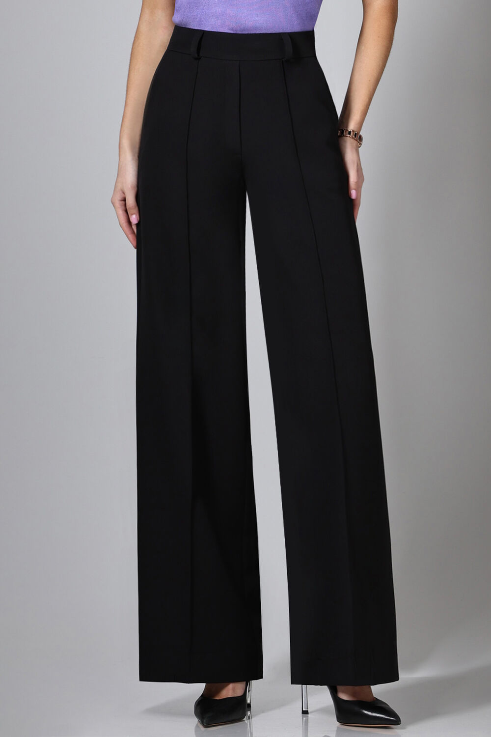 Брюки-палаццо чёрные с карманами от бренда SelenaSonata. Модель прямого кроя, удобная посадка. Выполнены из костюмного плотного. Притачной пояс со шлевками. В боковом шве застёжка на молнию. Идеальный выбор для создания стильного образа.