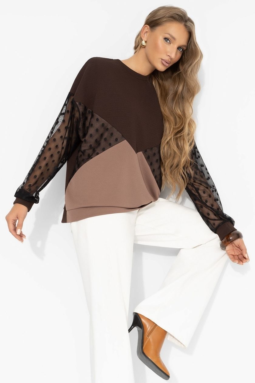Свитшот дизайнерский с рукавами из сетки от компании Charutti. Модель свободного силуэта, круглый вырез горловины. Длинные втачные рукава, со спущенной линией плеча. Низ изделия и рукавов на притачных манжетах. Прекрасное решение для создания стильного образа.