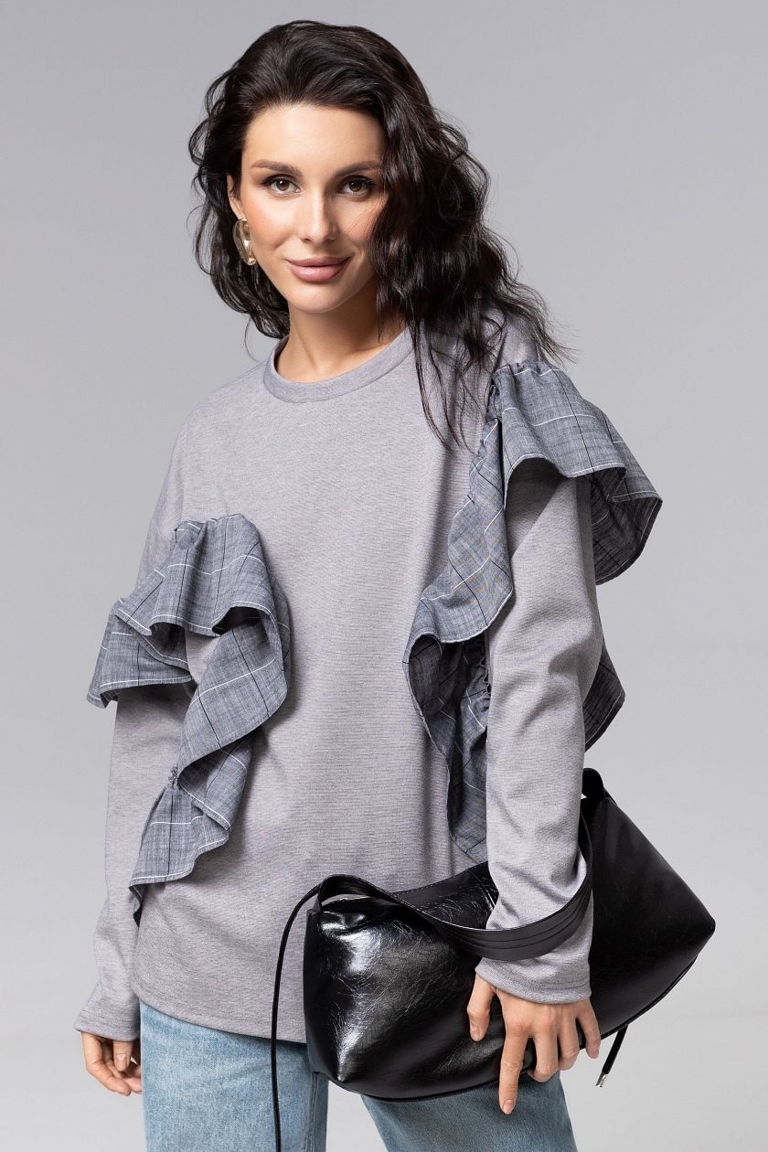 Лонгслив дизайнерский серого цвета от компании Charutti. Лонгслив свободного кроя, выполнен из трикотажного полотна. Круглый вырез горловины. Модель украшена элегантными объемными рюшами, которые создают выразительный акцент и подчеркивают женственный силуэт. Идеальный выбор для создания неповторимого образа.