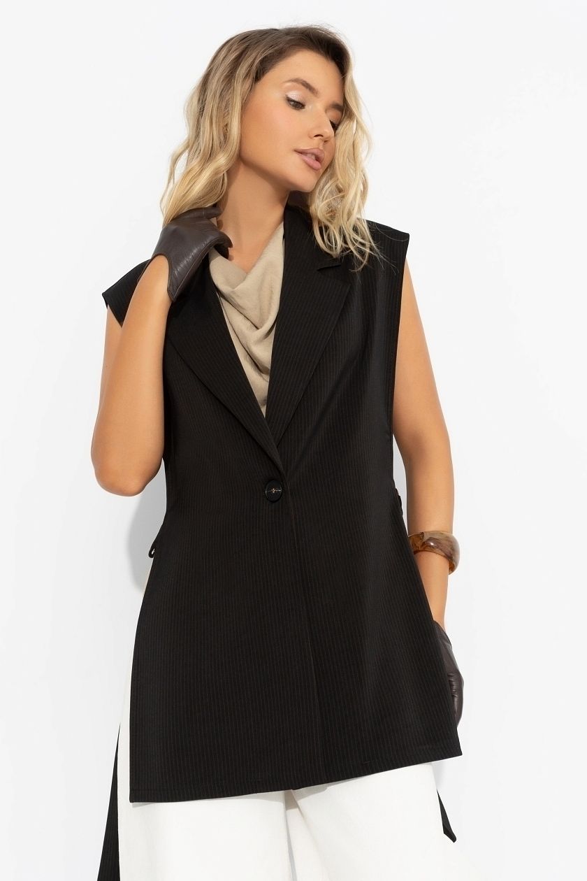 Жилет чёрный в тонкую полоску от компании Charutti. Модель прямого кроя, выполнена из костюмного полотна. Застёжка на пуговицу. Хорошо смотрится как самостоятельный предмет гардероба и как второй слой. Без подклада. Прекрасное решение для создания стильного образа.