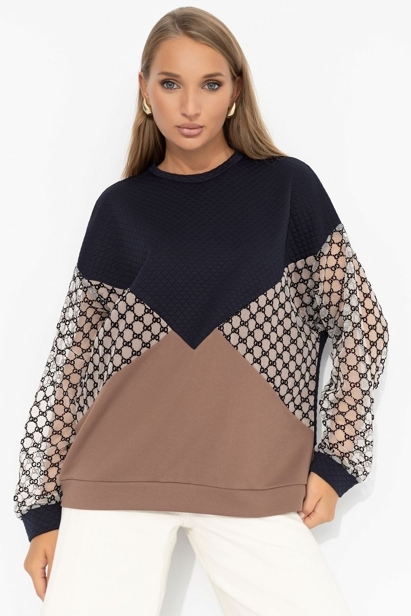 Свитшот дизайнерский с рукавами из сетки от компании Charutti. Модель свободного силуэта, круглый вырез горловины. Длинные втачные рукава, со спущенной линией плеча. Низ изделия и рукавов на притачных манжетах. Прекрасное решение для создания стильного образа.