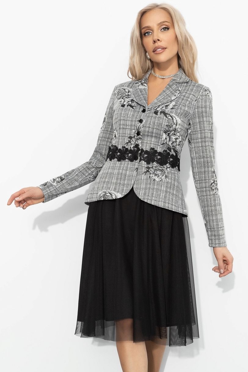 Костюм с юбкой в стиле Диор от компании Charutti. Жакет трикотажный приталенный с кружевом, кружево пришито. Длинные рукава, застёжка на пуговицу. Пояс юбки многослойной на резинке. Отличный выбор для создания стильного образа.
