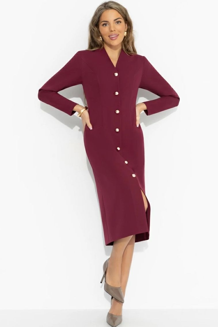 Платье бордовое на пуговицах от компании Charutti. Модель полуприлегающего силуэта, выполнена из костюмной ткани "барби". V-образный вырез горловины. Длинные втачные рукава. Минимум деталей – максимум обольщения.