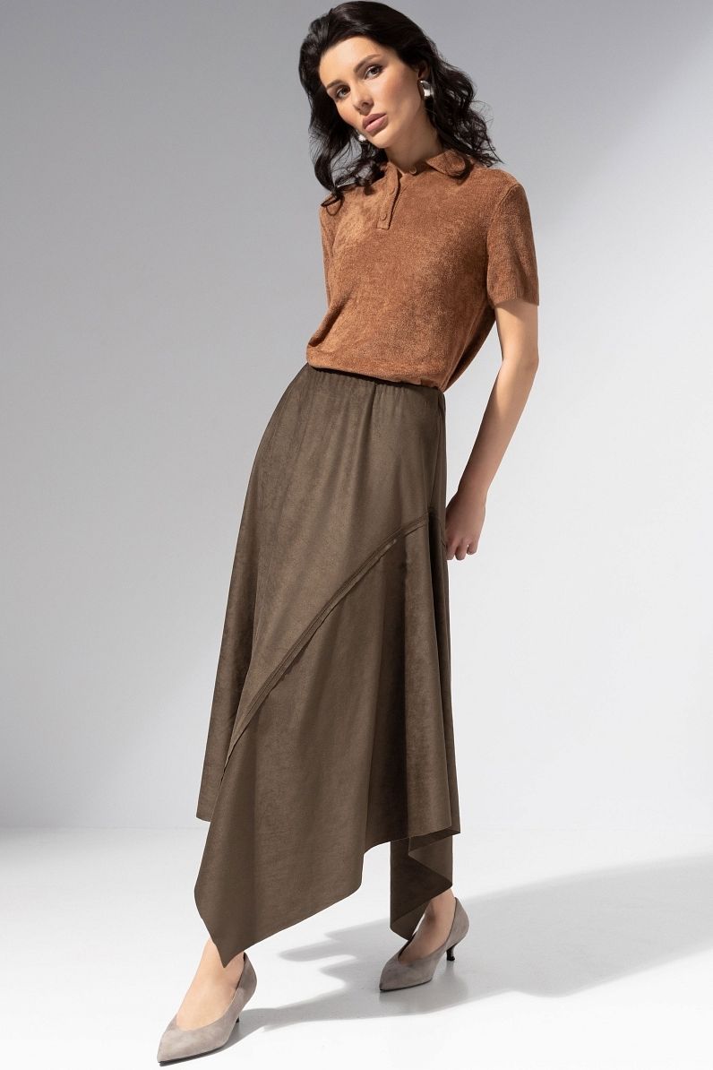 Юбка коричневая из мягкой эко-замши асимметричного кроя от компании Charutti на трикотажном подкладе. Эластичный пояс на скрытой резинке. Материал приятный на ощупь, драпируется и сохраняет форму. Акцентные декоративные швы. Идеальный выбор для создания женственного образа.