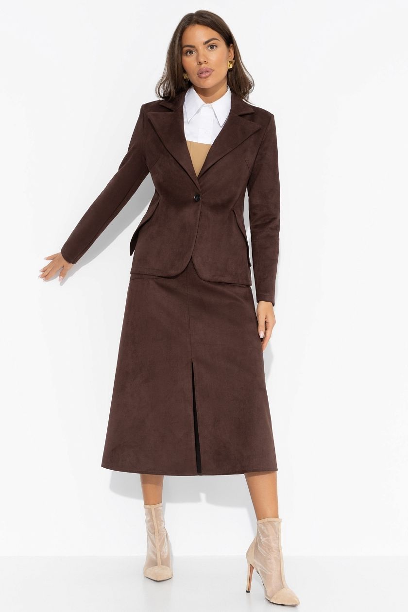 Юбка коричневая из замши с разрезом от компании Charutti. Модель приталенного силуэта в длине миди. Посадка высокая, на талии. Изделие застегивается на молнию и пуговицу. Есть карманы.Идеальный выбор для создания женственного образа.