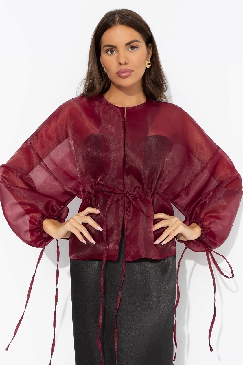 Жакет бордовый из органзы от компании Charutti. Свободный укороченный. Пояс на тонких завязках. Спущена линия рукава. Рукав оформлен длинными завязками. Идеальный выбор для создания стильного образа.