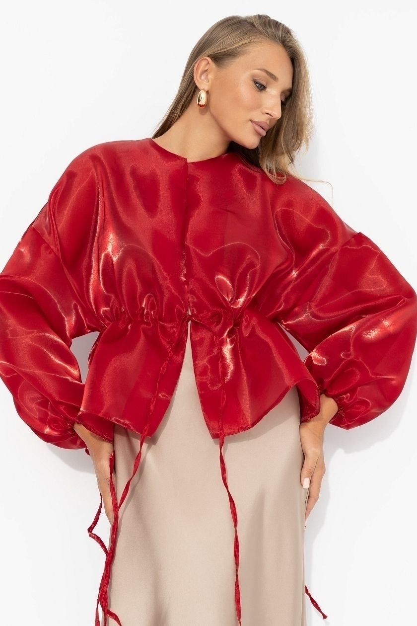 Жакет из органзы красного цвета от компании Charutti. Свободный укороченный. Пояс на тонких завязках. Спущена линия рукава. Рукав оформлен длинными завязками. Идеальный выбор для создания стильного образа.