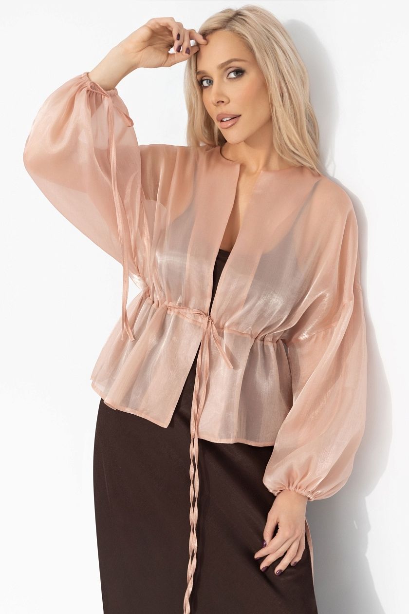 Жакет розовый из органзы от компании Charutti. Свободный укороченный. Пояс на тонких завязках. Спущена линия рукава. Рукав оформлен длинными завязками. Идеальный выбор для создания стильного образа.